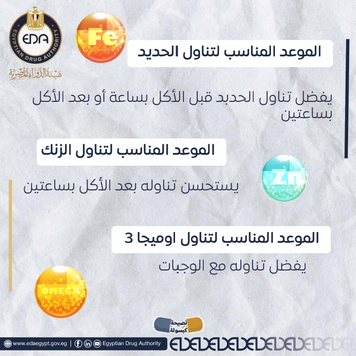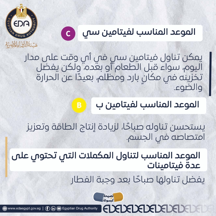 وأوضحت هيئة الدواء المصرية أنه لتحقيق أقصى قدر من الإستفادة يجب تناول هذه الفيتامينات بعد تناول الأطعمة التي تحتوي على دهون.