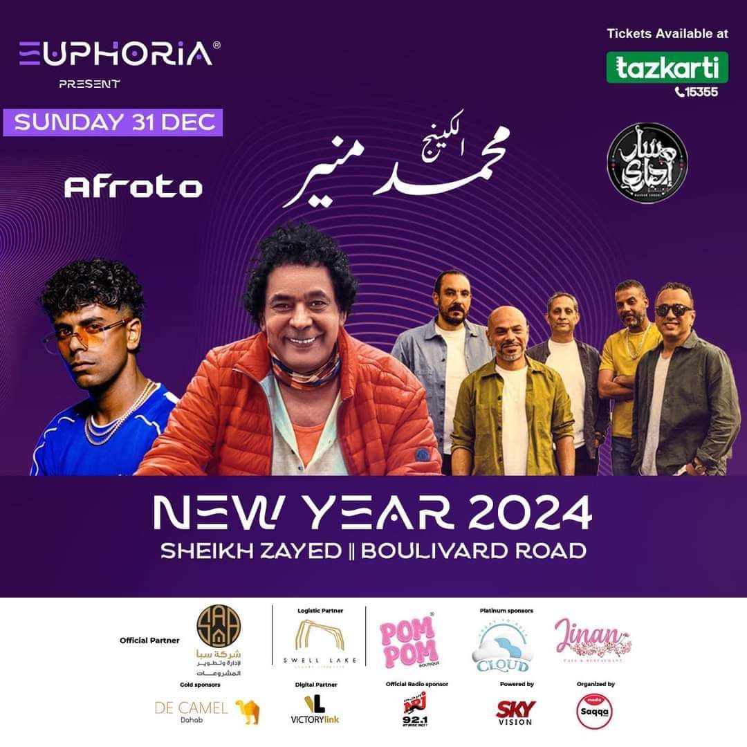 وتأتي الحفل يوم 31 ديسمبر بمشاركة الكينج ومغني الراب عفروتو والفرقة الموسيقية مسار إجباري مسرح إیفوریا Euphoria Walkway