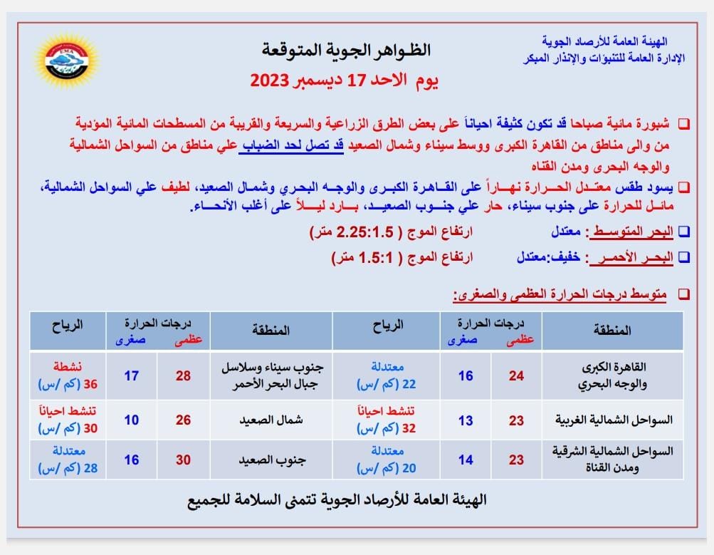 كما توقعت هيئة الارصاد الجوية أن يسود طقس بارد على شمال البلاد والقاهرة الكبرى والوجه البحرى حتى شمال الصعيد وعلى جنوب الصعيد.