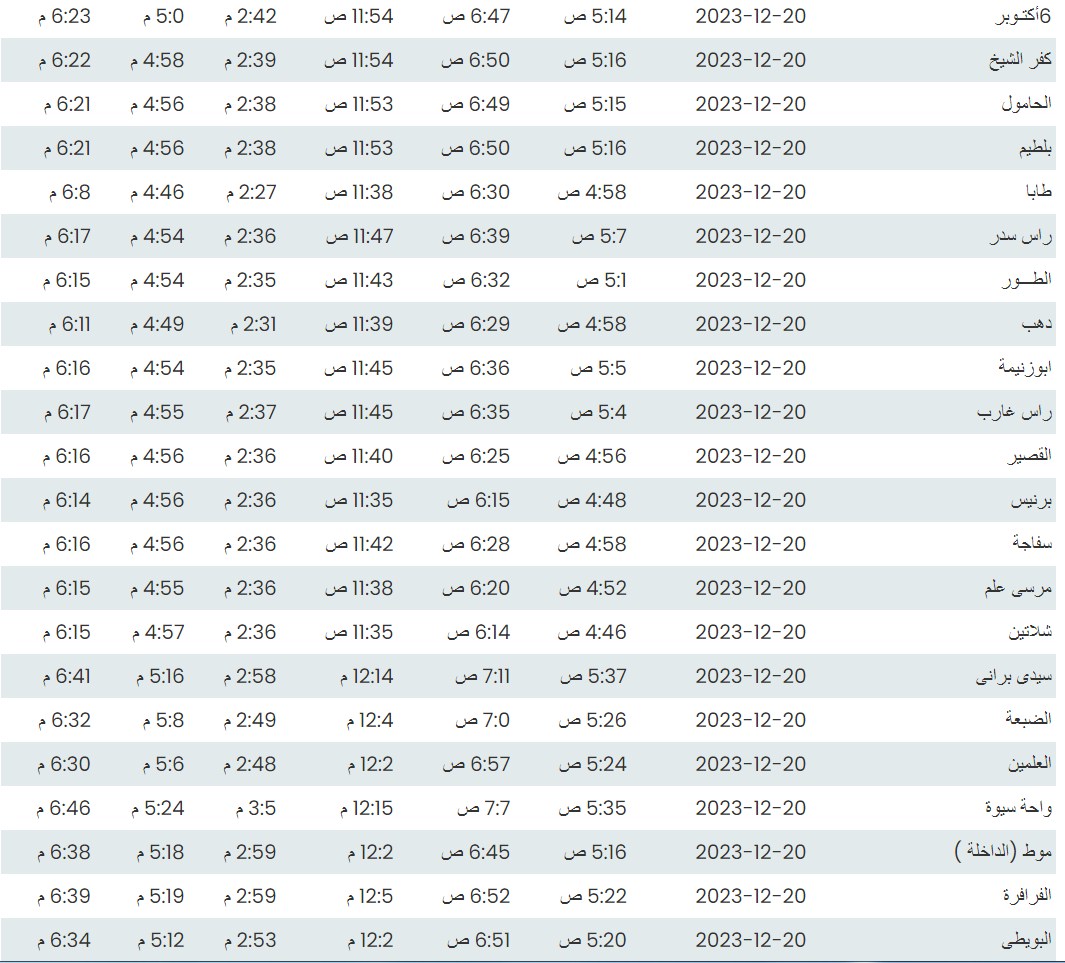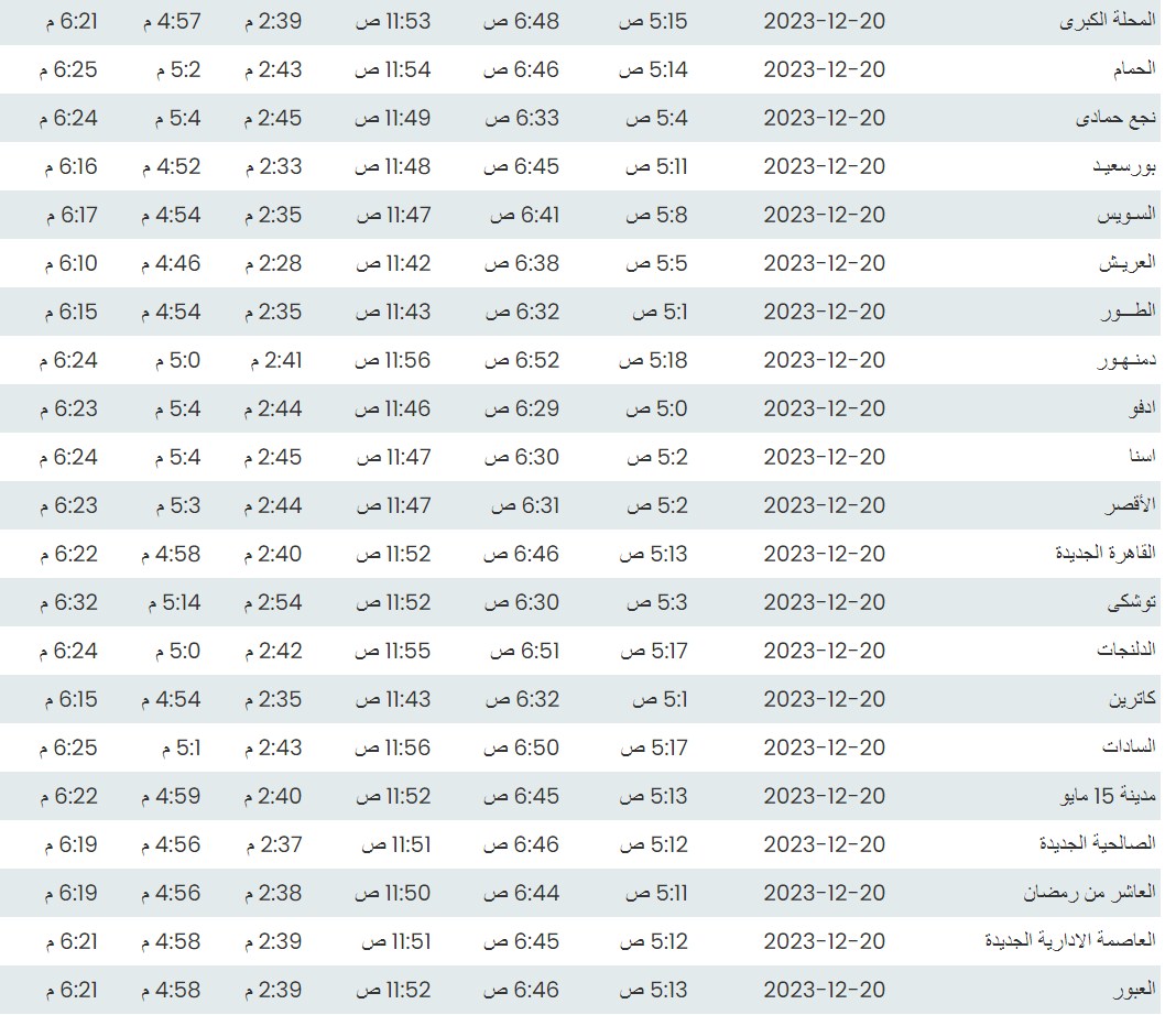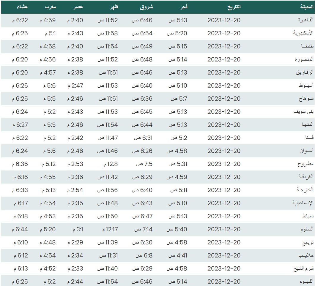 مواقيت الصلاة اليوم وفقًا للتوقيت المحلي لمدينتي القاهرة والإسكندرية وكذلك،مواقيت الصلاة، لعدد من مدن ومحافظات الجمهورية من واقع بيانات الهيئة العامة للمساحة