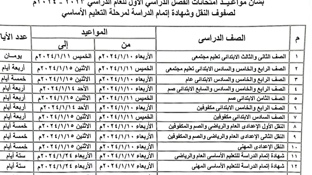 اعتمد عبد الحميد الهجان محافظ القليوبية مواعيد بداية امتحانات الفصل الدراسى الأول لصفوف النقل وشهادة إتمام الدراسة لمرحلة التعليم الأساسى للعام الدراسى 2023/2024 وذلك على النحو التالى:
