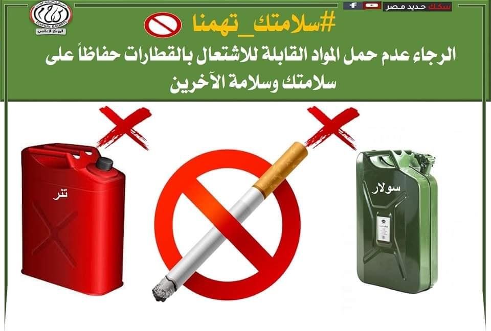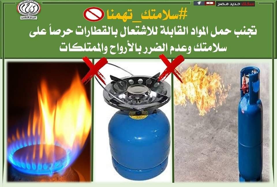 وتعتبر أسطوانات الغاز وجراكن الوقود من المواد غير المسموح بدخولها لعربات القطار نتيجة الخطر الكبير التي تشكله هذه المواد على سلامة الركاب أثناء رحلة القطار وتسعى هيئة السكة الحديد من خلال تغليظها للعقوبات على ردع بعض الخارجين عن تعليمات السلامة الخاصة بعربات القطار.