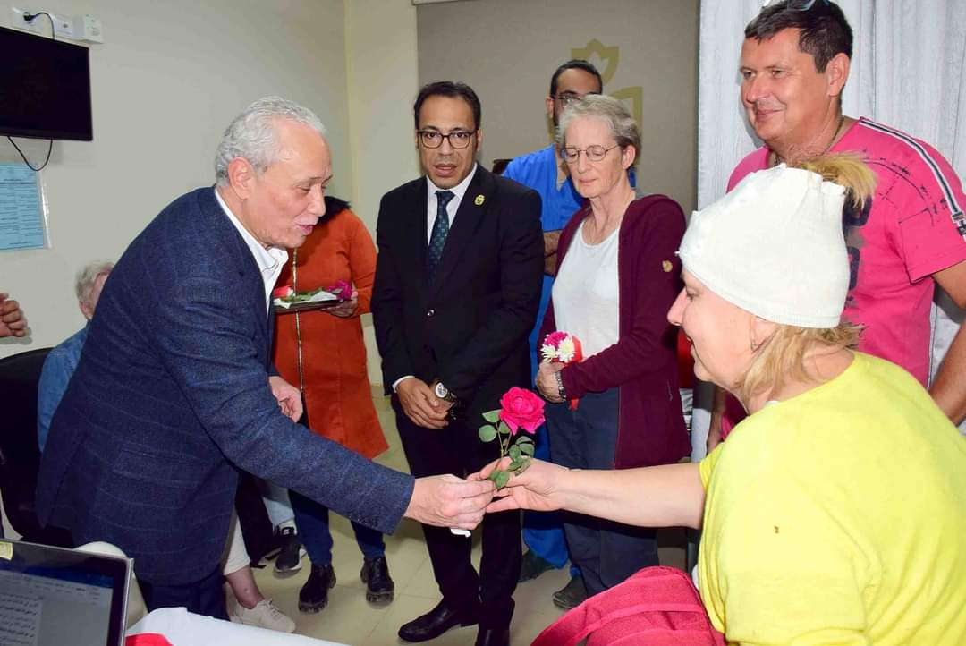 كما التقى المحافظ بمسئولي الشركة المنظمة لرحلة السائحين، لمتابعة تقديم كافة الخدمات لهم، وتلبية رغبة من يرغب في استكمال العلاج بدولته بعد اتخاذ الاجراءات اللازمة.