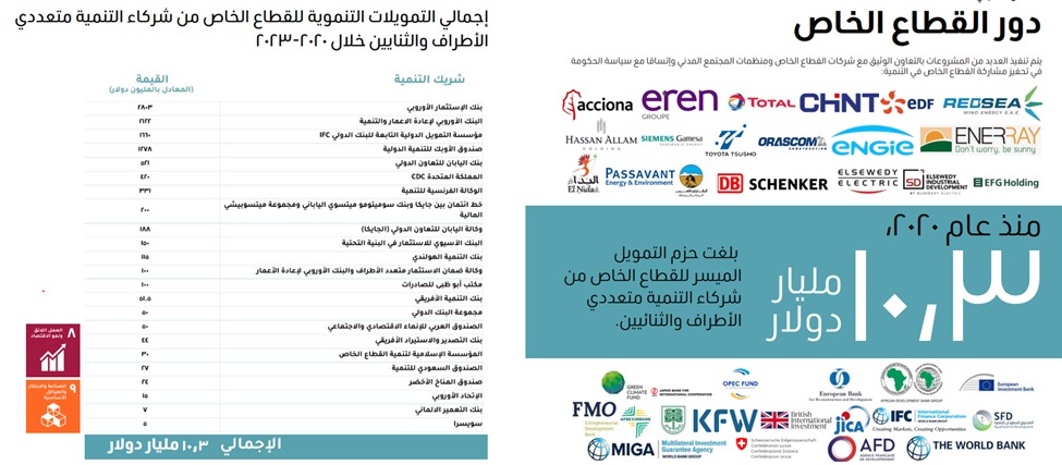 ووفقًا للتقرير فإن جهود الشراكات الدولية تنعكس على تمكين القطاع الخاص، من خلال العديد من الآليات بشكل مباشر وغير مباشر، ومن بين الآليات المباشرة، وتمويل المشروعات القومية الكبرى، والاستثمار فى رأس المال، وتسهيلات التجارة الخارجية، والخدمات الاستشارية والفنية وبناء القدرات، وضمانات الاستثمار، إلى جانب الآليات غير المباشرة ومنها الدعم الفني والاستشاري لتعزيز بيئة الأعمال اللازمة لتمكين القطاع الخاص، وتمويل المشروعات التنموية بالشراكة مع القطاع الخاص، وخطوط الائتمان.