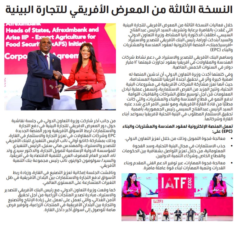 خلال فعاليات النسخة الثالثة من المعرض الأفريقي للتجارة البينية التي عُقدت بالقاهرة أطلقت الدكتورة رانيا المشاط، وزيرة التعاون الدولي، وبندكت أوراما، رئيس البنك الأفريقي للتصدير والاستيراد "أفرسيكمبنك"، المنصة الإلكترونية لعقود الهندسة والمشتريات والبناء (EPC)، والتي تهدف إلى معالجة فجوة التمويل وذلك من خلال تعزيز التعاون الدولي، وجذب الاستثمارات في مجال البنية التحتية، وسد الفجوة المعلوماتية، من خلال تعزيز التواصل بشفافية بين الحكومات والقطاع الخاص وشركاء التنمية الدوليين، ومعالجة فجوة المهارات، عبر توفير الدعم الفني المقدم وبناء القدرات وتنمية المهارات لبناء قوة عاملة ماهرة.