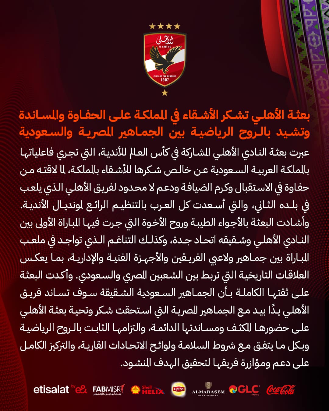 عبرت بعثة النادي الأهلي المشاركة في كأس العالم للأندية، عن خالص شكرها للأشقاء بالمملكة العربية السعودية بسبب الاستقبال وكرم الضيافة والدعم الكبير للنادي في مونديال الأندية.