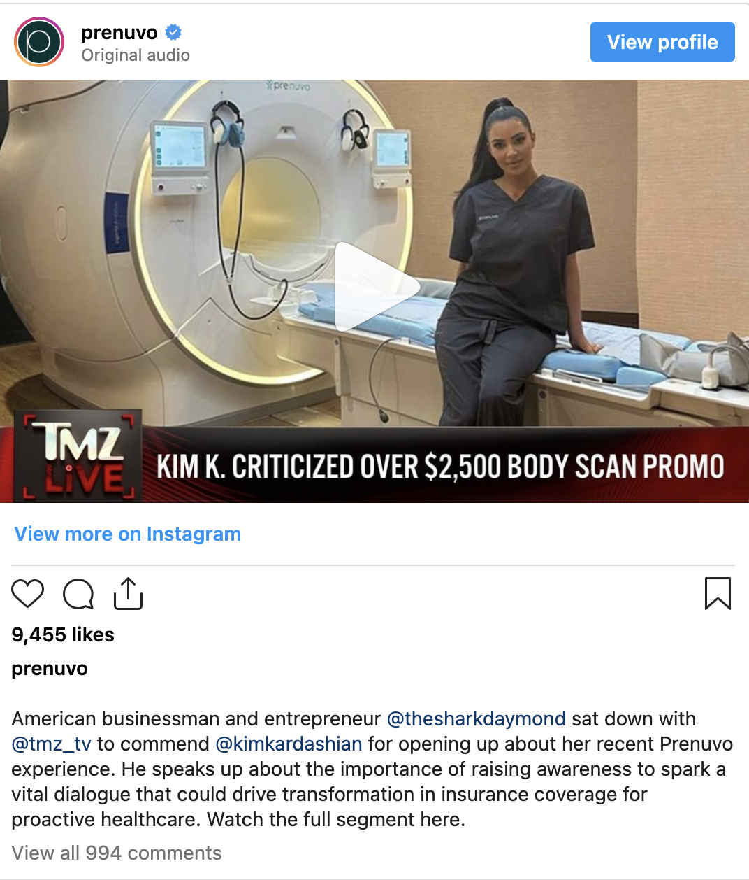 ونشرت نجمة تلفزيون الواقع الأمريكي، مقطع فيديو لها، وهي تكشف عن هديتها الغريبة، التي تلقتها من شركة Prenuvo، والتي تقوم بفحص كامل الجسم، والتي استضافت أيضا، بعض أفراد أسرة كيم الآخرين لإجراء فحص تشخيصي لجسمهم.