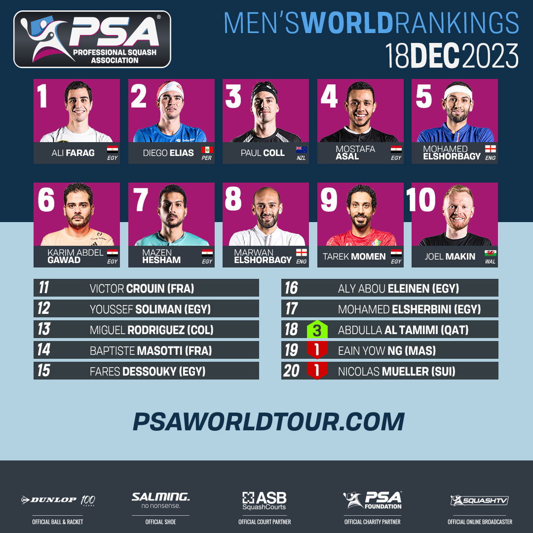 الإسكواش، علي فرج يواصل التربع على عرش التصنيف العالمي