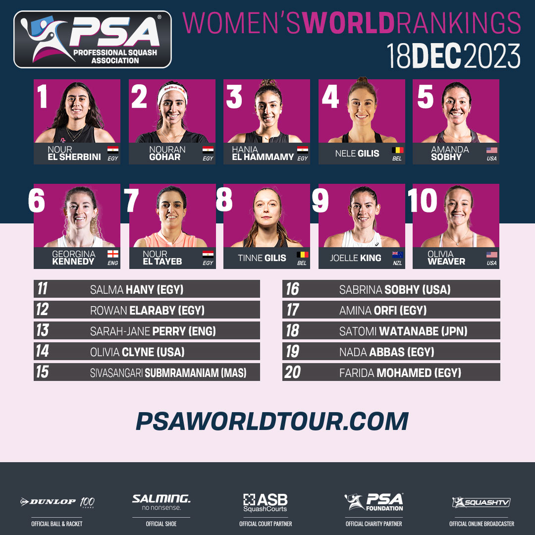 وجاءت نور الشربيني في المركز الأول، فيما حلت المصرية نوران جوهر في المركز الثاني، وزميلتها هانيا الحمامي في المركز الثالث، واحتلت البلجيكية نيلي جيليس المركز الرابع، والأمريكية أماندا صبحي في المركز الخامس.
