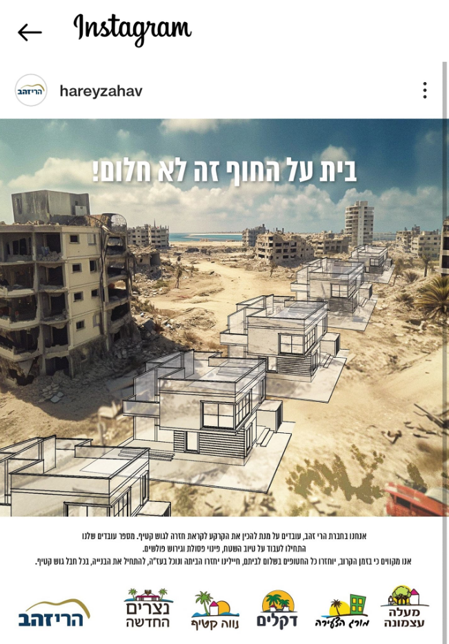 وقامت شركة "هاري زهاف"، شركة عقارات إسرائيلية، بترويج إعلانها، الذي ادعت فيه بأنها ستشيد مئات المستوطنات غير القانونية في الضفة الغربية، وتشجع على إقامة مستوطنات فوق أنقاض غزة بعد تطهيرها عرقيًا، الأمر الذي استفز النشطاء، الرافضين لجرائم الاحتلال الإسرائيلي، والداعمين لحق الفلسطينيين، والرافضين لاقامة المستوطنات على أرض غزة وعلى بقايا منازل أهل القطاع.