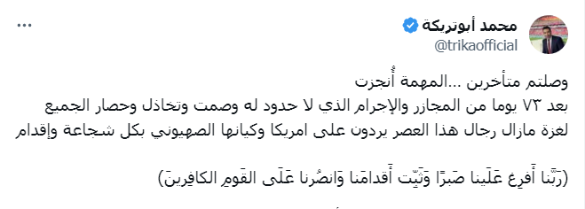 وعن المهمة أنجزت، قال محمد أبو تريكة: "وصلتم متأخرين …المهمة أُنجزت بعد ٧٣ يوما من المجازر والإجرام الذي لا حدود له وصمت وتخاذل وحصار الجميع لغزة مازال رجال هذا العصر يردون على أمريكا وكيانها الصهيوني بكل شجاعة وإقدام ﴿رَبَّنا أَفرِغ عَلَينا صَبرًا وَثَبِّت أَقدامَنا وَانصُرنا عَلَى القَومِ الكافِرينَ﴾