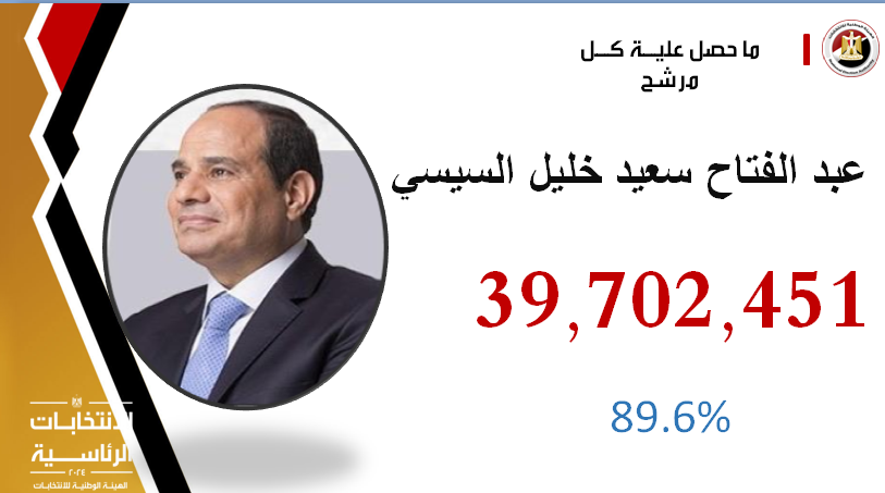 - أصوات المرشح عبد الفتاح السيسي 39 مليونا و702 و451 صوتا بنسبة 89.6 %