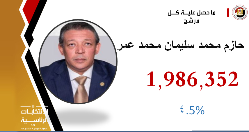 - أصوات المرشح حازم عمر مليون و689 ألفا و356 صوتا 4.5 %