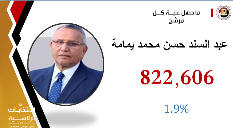 - أصوات المرشح عبد السند يمامة 822 ألفا و606 أصوات بنسبة 1.9 %