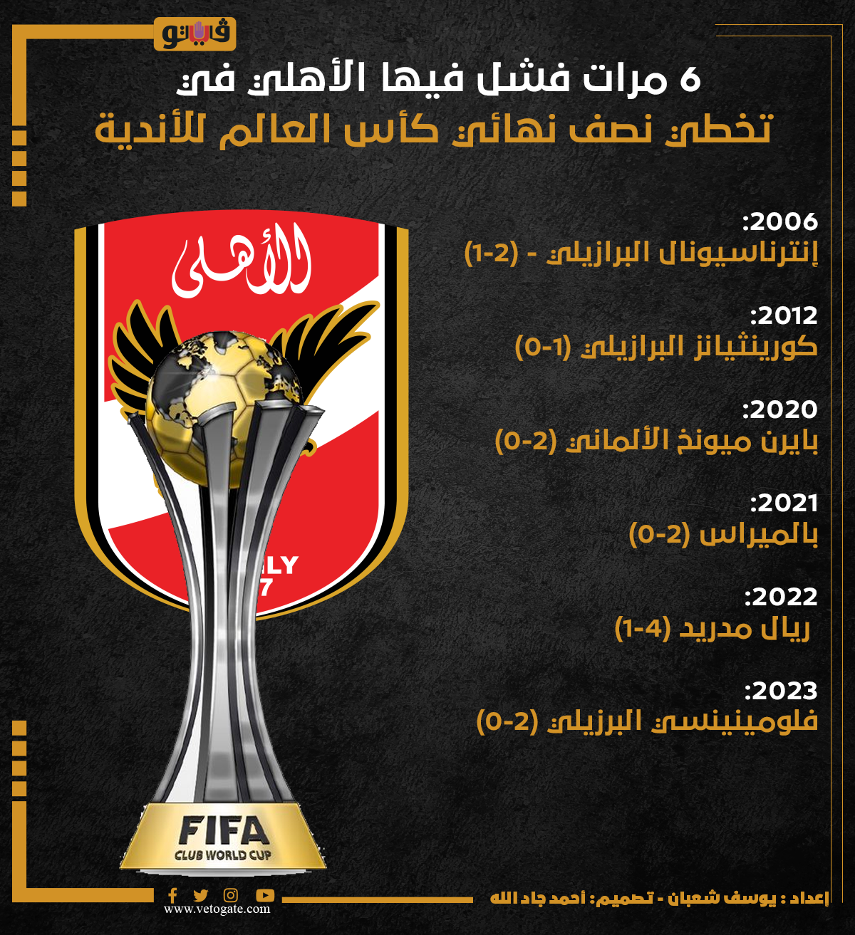 6 مرات فشل فيها الأهلي في تخطي نصف نهائي كأس العالم للأندية (انفوجراف) الثلاثاء 19/ديسمبر/2023 - 11:06 ص 12/19/2023 11:06:39 AM الأهلي يسقط بالخسارة أمام فلومينينسي، فيتو يوسف شعبان شارك طباعة 18 حجم الخط شارك طباعة كأس العالم للأندية النادي الأهلي فلومينينسي البرازيلي انترناسيونال البرازيلي كورينثيانز البرازيلي بالميراس