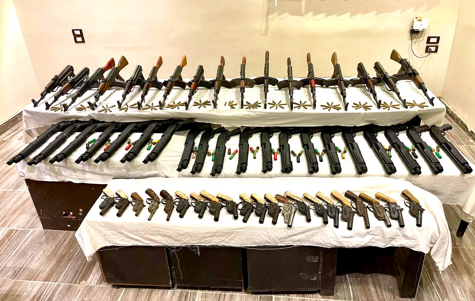 ضبط 31 قضية سلاح نارى.. ضُبط خلالهم (17 بندقية آلية- 20 بندقية خرطوش- 21 فرد محلى – عدد من الطلقات مختلفة الأعيرة) بحوزة (31 متهم لـ 23 منهم معلومات جنائية")