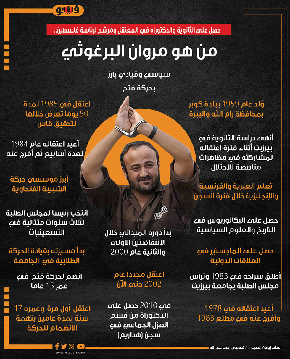 حصل على الثانوية والدكتوراه في المعتقل ومرشح لرئاسة فلسطين.. من هو مروان البرغوثي (إنفوجراف) الثلاثاء 19/ديسمبر/2023 - 05:39 م 12/19/2023 5:39:26 PM مروان البرغوثي، فيتو إيمان الحديدى شارك طباعة 18 حجم الخط شارك طباعة رئيس فلسطين سجون الاحتلال جامعة بيرزيت مروان البرغوثي