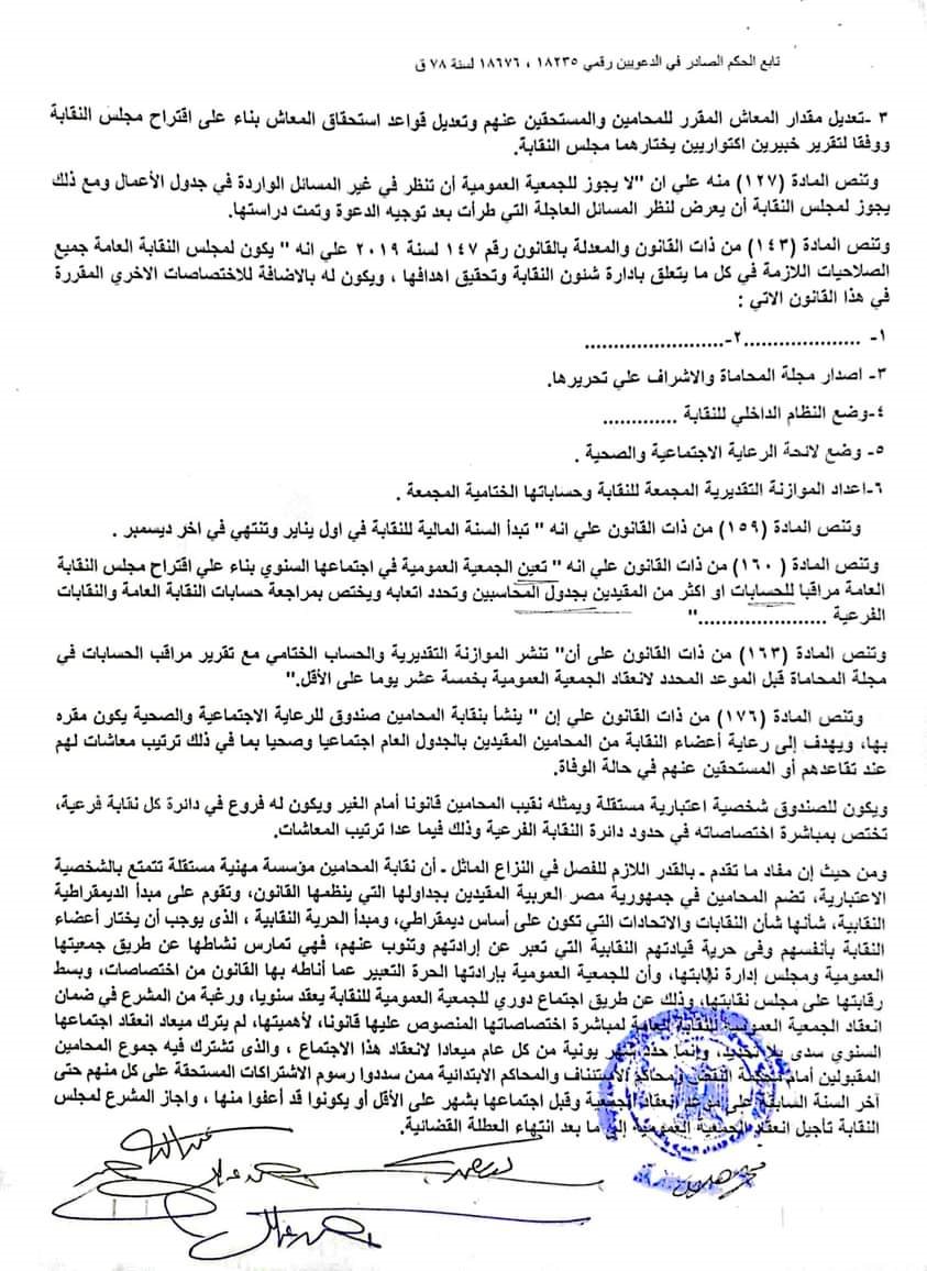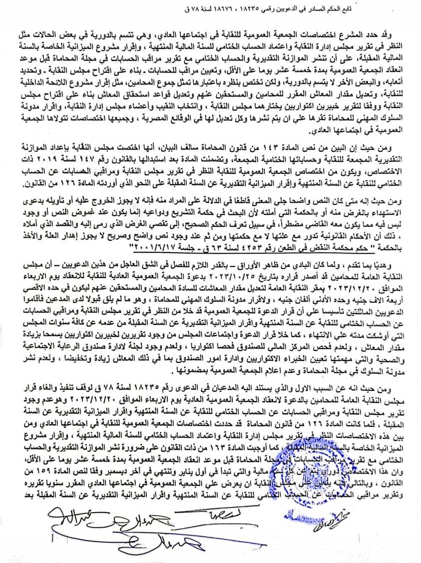 ذكرت المحكمة أن الدعوة لعقد جمعية عمومية جاء خاليٱ من ادراج بند الميزانية العامة للعام المنتهي،وكذلك ادراج الميزانية التقديرية عن العام المقبل،وعدم نشرها بمجلة النقابة قبل ١٥ يوم من الإعلان عن انعقادها.