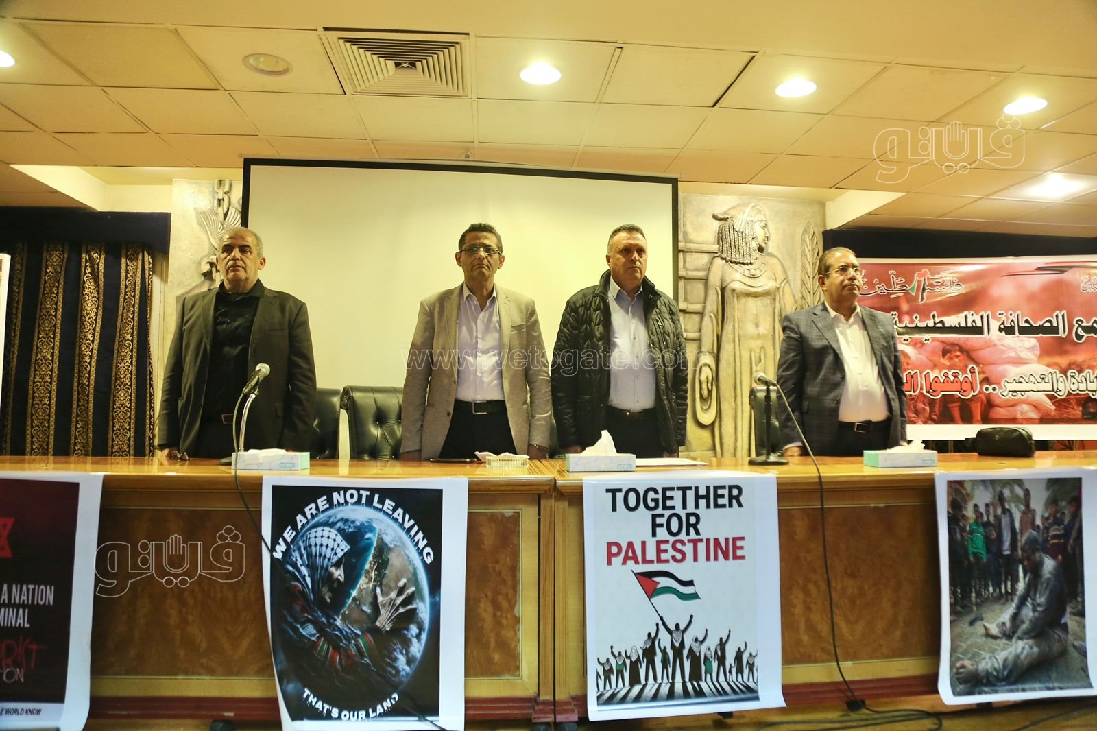وجرى عقد مؤتمرا صحفيا شارك فيه خالد البلشي، نقيب الصحفيين، وناصر أبوبكر، نقيب صحفيى فلسطين، ومنير زعرور، مدير البرامج والسياسات فى الشرق الأوسط للاتحاد الدولى للصحفيين، ويعلن خلاله عن خطوات التنسيق بين نقابتى مصر، وفلسطين، والاتحاد الدولى للصحفيين، لاتخاذ خطوات أمام الجنائية الدولية ضد استهداف قوات الاحتلال للصحفيين باعتبارها جرائم حرب، ويتخلل المؤتمر فيلم تسجيلى قصير بعنوان قصة عنف-.