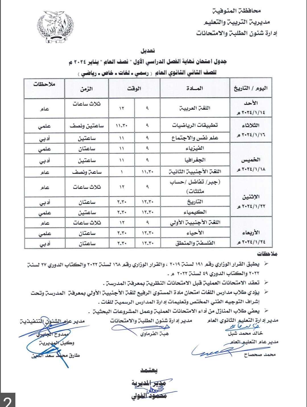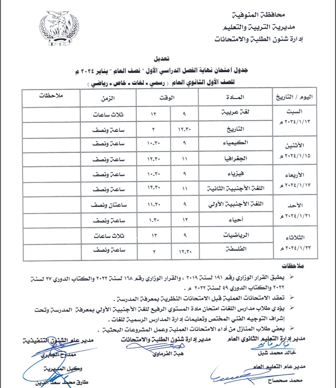 أجرت قبل قليل، مديرية التربية والتعليم بمحافظة المنوفية، بعض التعديلات على جداول امتحانات الفصل الدراسي الأول والمزمع إقامتها فى شهر يناير من العام القادم.