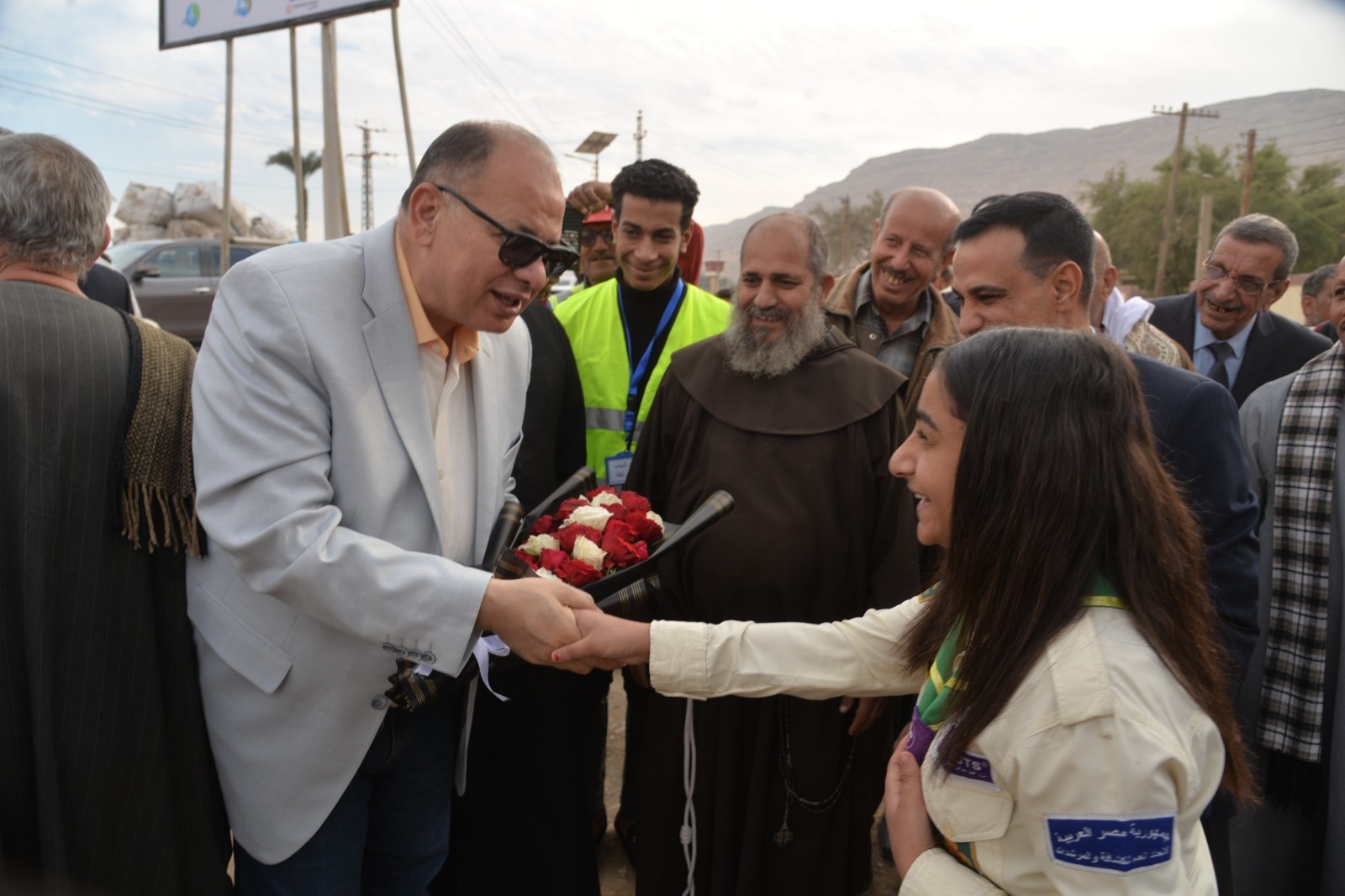 حيث استقبل المحافظ أهالى القرية ورجال الدين الإسلامي والمسيحى وبمشاركة شباب وأطفال القرية والكشافة رافعين الاعلام مرددين عبارات الترحيب و"تحيا مصر" مرحبين بالضيوف الكرام معبرين عن سعادتهم بتشغيل المشروع لخدمة اهالى القرية وتحسين الخدمات المقدمة لهم.