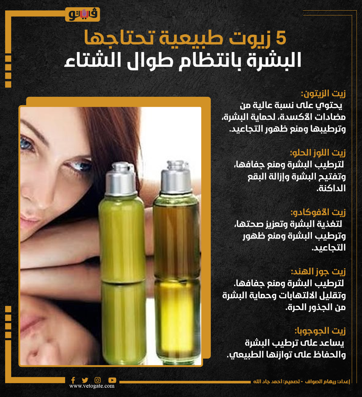 5 زيوت طبيعية تحتاجها البشرة بانتظام طوال الشتاء (إنفوجراف) الخميس 21/ديسمبر/2023 - 05:15 م 12/21/2023 5:15:03 PM زيوت للشعر، فيتو ريهام الصواف شارك طباعة 18 حجم الخط شارك طباعة زيوت طبيعية للشعر افضل زيوت للشعر زيت لشعرك زيوت للشعر زيت اللوز زيت الأرجان وفوائده