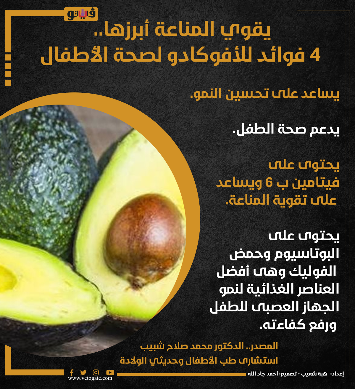 يقوي المناعة أبرزها.. 4 فوائد للأفوكادو لصحة الأطفال (إنفوجراف) الخميس 28/ديسمبر/2023 - 10:30 م 12/28/2023 10:30:40 PM الأفوكادو، فيتو هبة شعيب شارك طباعة 18 حجم الخط شارك طباعة الأفوكادو فوائد الافوكادو الدكتور محمد صلاح شبيب فوائد الأفوكادو للأطفال