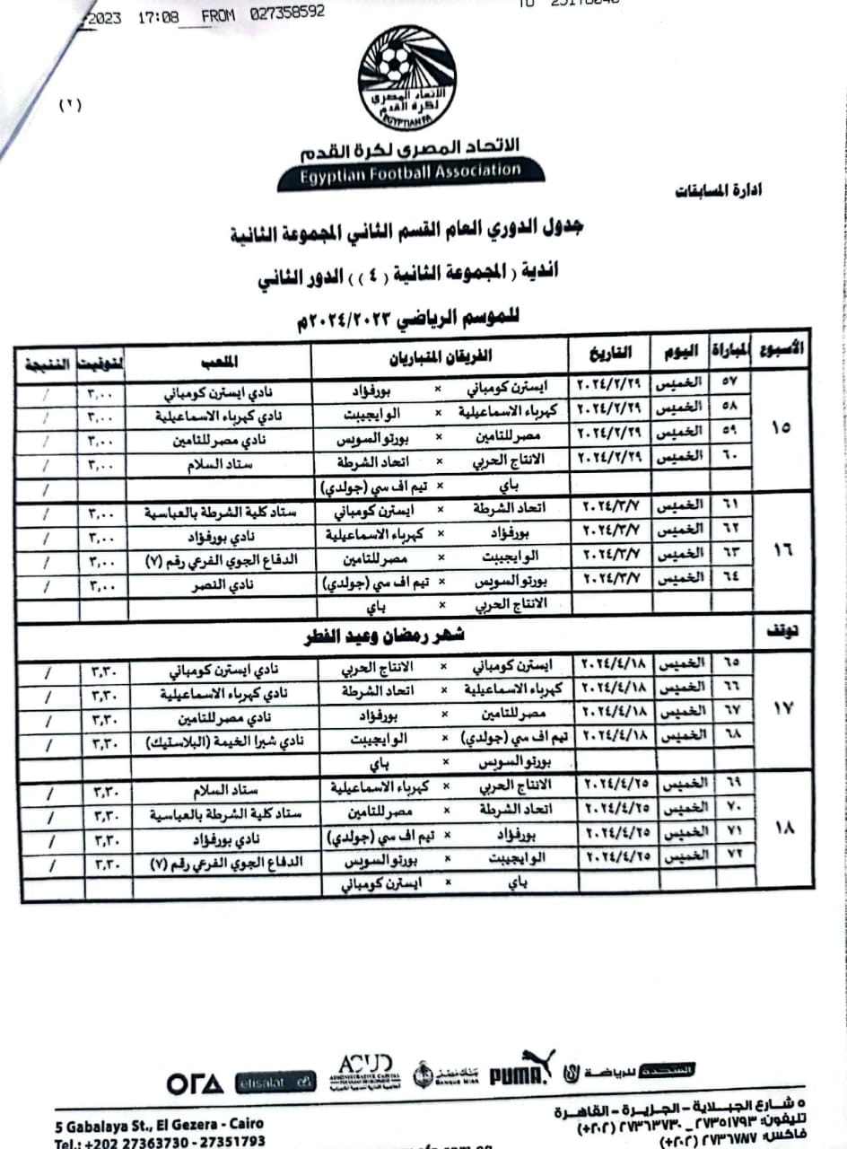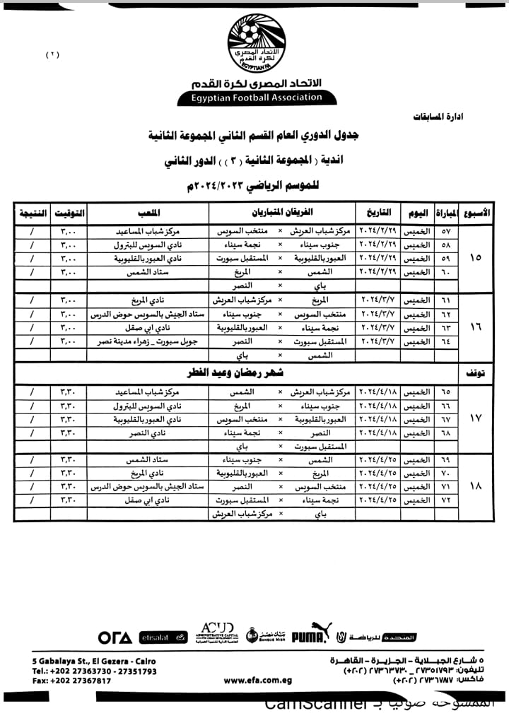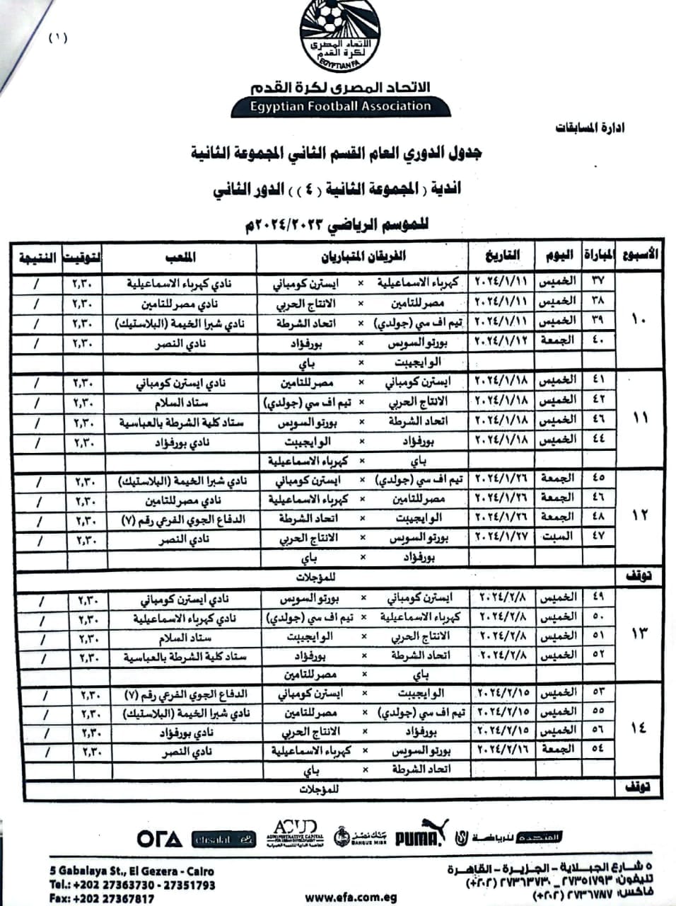جدول مباريات الدور الثاني بدوري القسم الثاني مجموعتي القاهرة والقناة