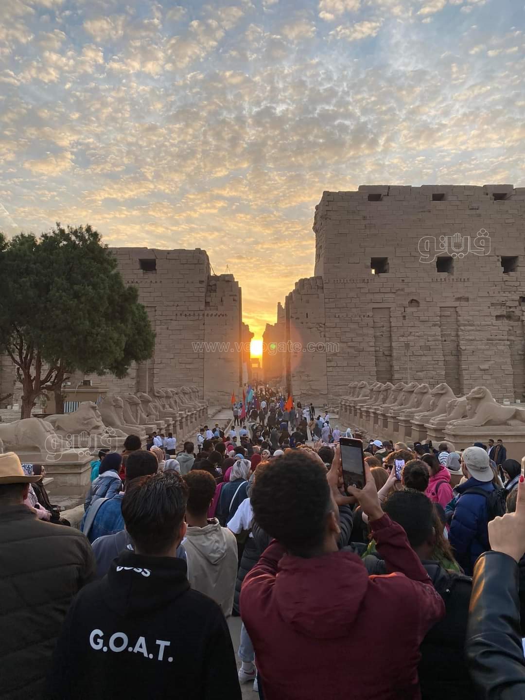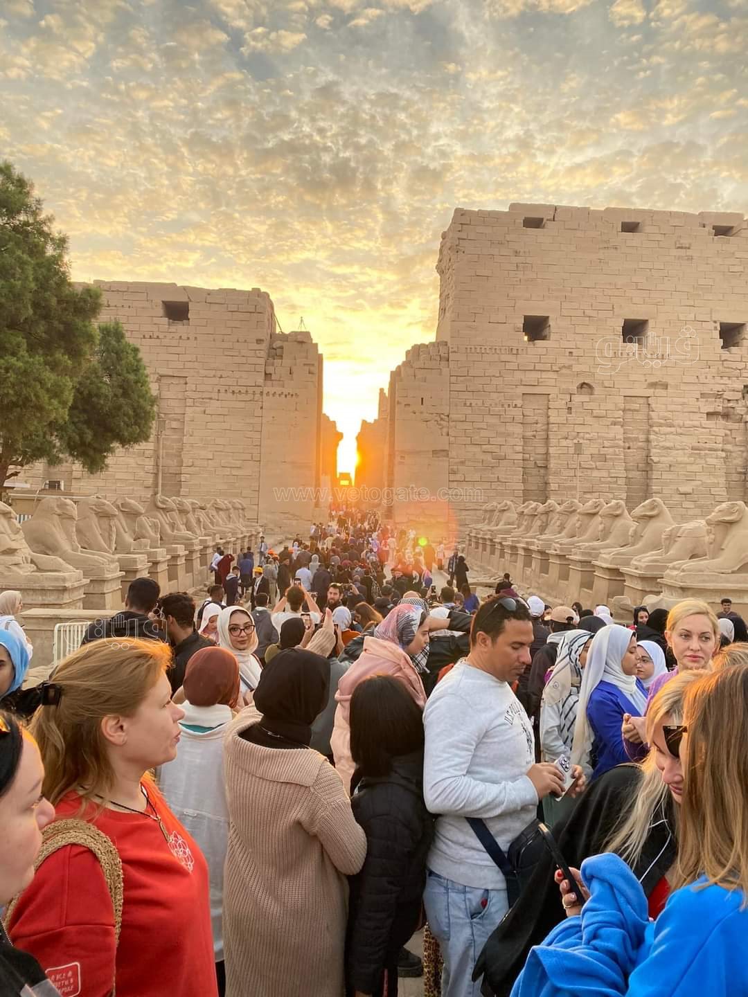 ظهر مجموعات من السائحين الأجانب يؤدون طقوسا لصلوات الشمس داخل مقصورة قدس الأقداس الإله آمون رع بمعبد الكرنك التي تعامدت عليها الشمس وقت شروقها تدريجيا، اليوم الخميس، في ظاهرة فلكية فريدة من نوعها.