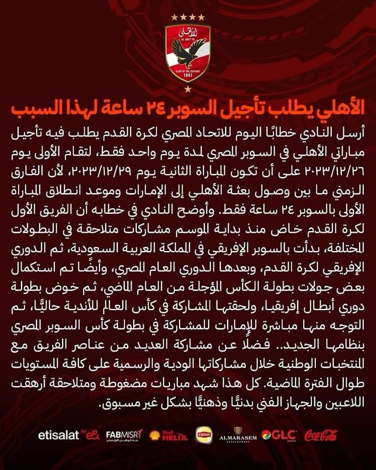 أرسل النادي الأهلي خطابًا اليوم للاتحاد المصري لكرة القدم، يطلب فيه تأجيل مباراتي الأهلي في السوبر المصري لمدة يوم واحد فقط، لتقام الأولى يوم 26 ديسمبر على أن تكون المباراة الثانية يوم 29 ديسمبر، لأن الفارق الزمني ما بين وصول بعثة الأهلي إلى الإمارات وموعد انطلاق المباراة الأولى بالسوبر ٢٤ ساعة فقط.