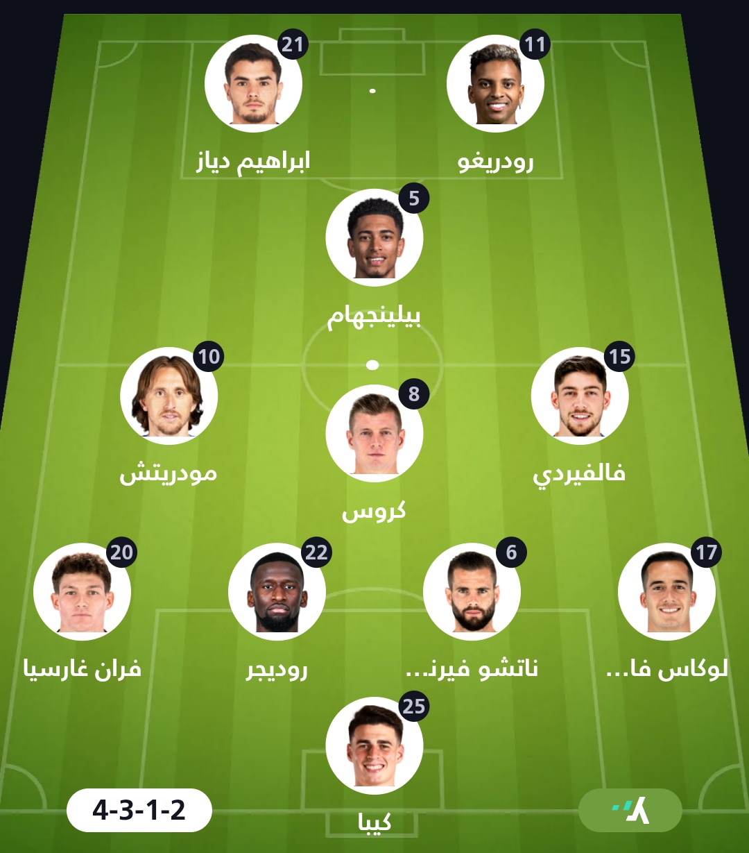 الوسط: جود بيلينجهام - توني كروس - لوكا مودريتش - فيدي فالفيردي - أوريلين تشواميني - داني سيبايوس - نيكو باز.