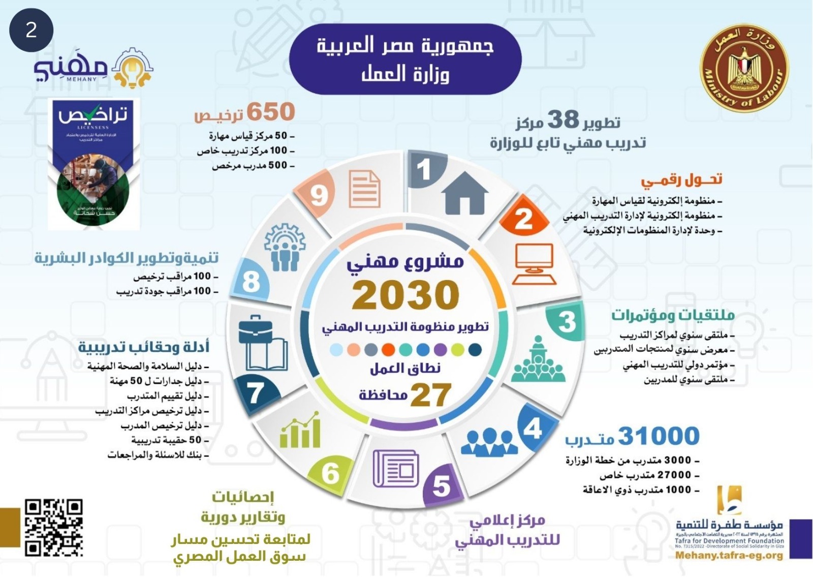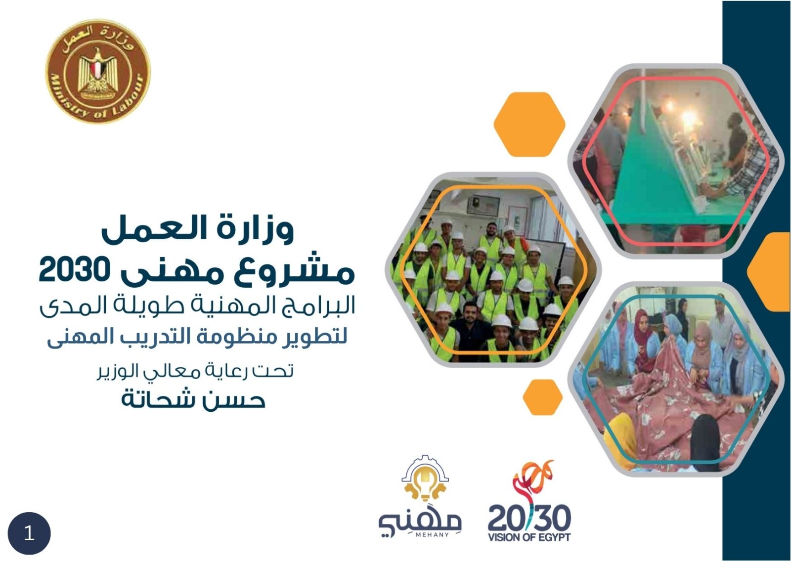 قال بيان للوزارة بشأن "المشروع "، انه في إطار رؤية وزارة العمل، وأهدافها ودورها في رسم السياسة القومية لتدريب وتأهيل الشباب من الجنسين لسد احتياجات سوق العمل المحلي والدولي، والإشراف على تنفيذها من خلال مراكز التدريب المهني علي مستوى الجمهورية،والحفاظ على معايير الجودة لقياس المهارة والأداء، لضمان عِمالة مُؤهلة للتشغيل طبقا لاحتياجات سوق العمل،سيتم إطلاق مشروع "مهني 2030" بالتعاون مع مؤسسة طفرة للتنمية،لتنفيذ البرامج المهنية طويلة المدى التي تقدم بفترة زمنية تتراوح من "3 – 12 شهر"،وذلك في مجموعة من التخصصات هي:أعمال المساحة والإنشاءات،وإدارة الأعمال والسكرتارية،والصحافة والإعلام،وتكنولوجيا المعلومات،ومساعد الخدمات الصحية،والخدمات البترولية وحفر الأبار،والسياحة والفنادق،والتبريد والتكييف،والصناعات الغذائية،والهندسة الإلكترونية، والتفصيل والخياطة،والتربية والرعاية المنزلية.