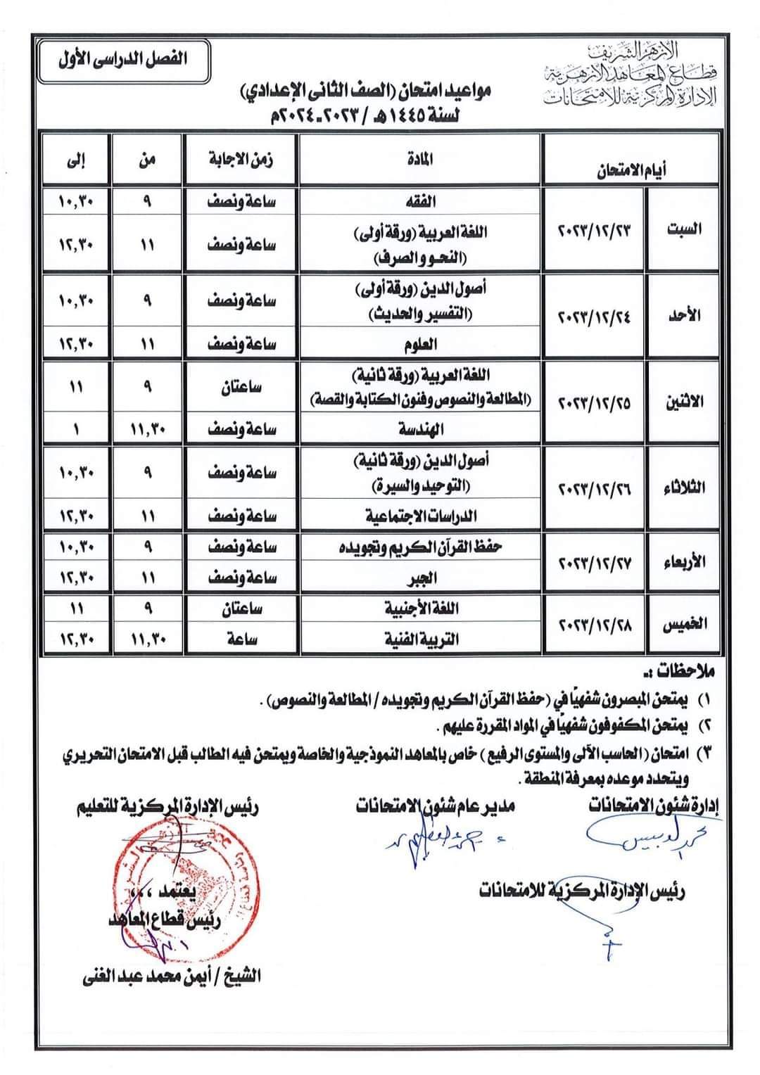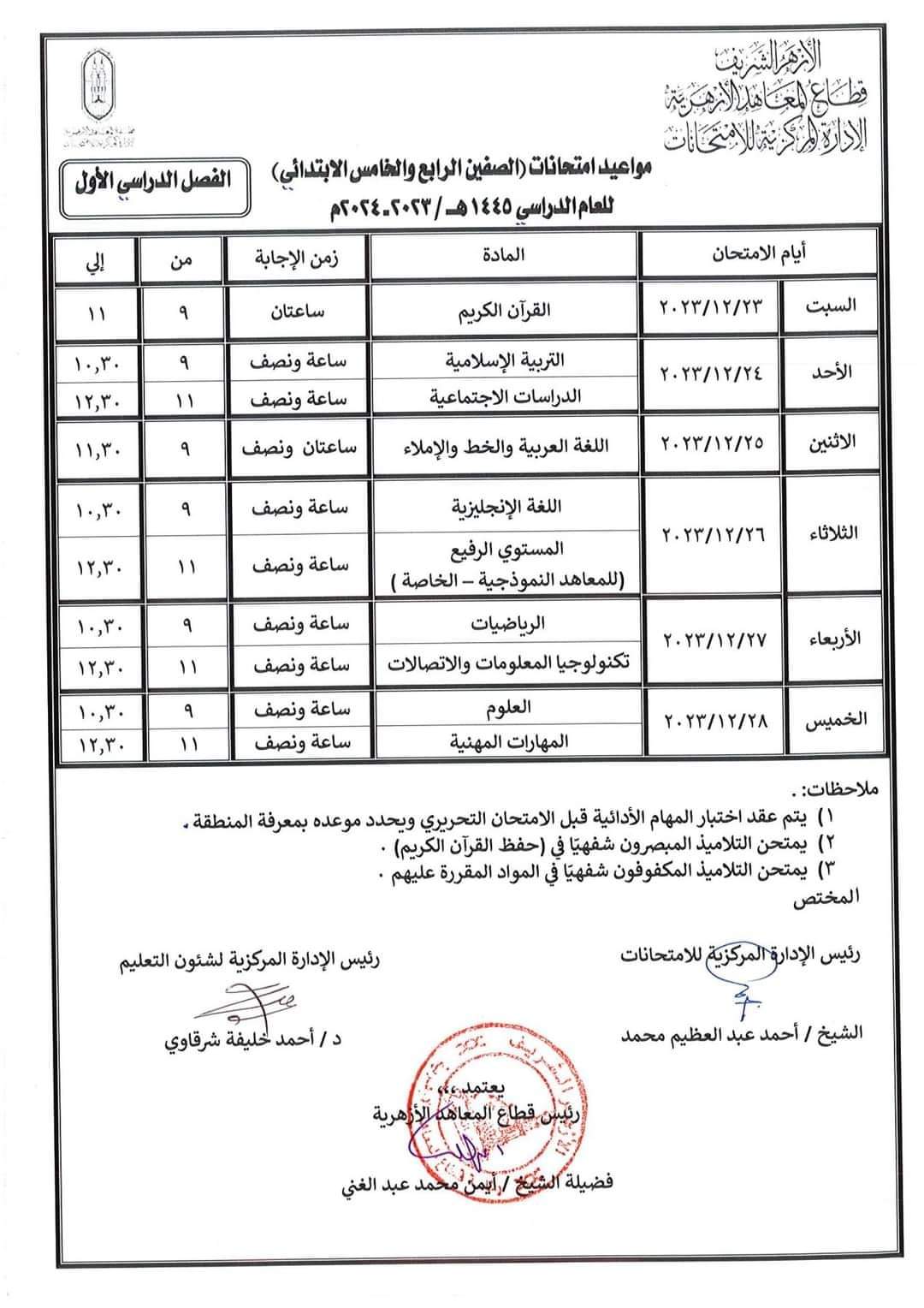 تنطلق غدا السبت امتحانات الفصل الدراسي الأول للصفوف ( الرابع - الخامس ) الابتدائي، (الأول - الثانى ) الإعدادي، للعام الدراسي ٢٠٢٤/٢٠٢٣ م، في المعاهد الأزهرية.
