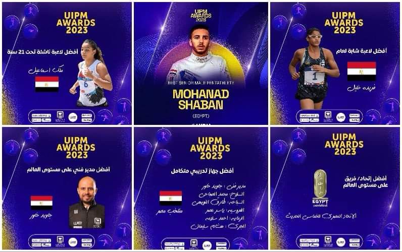 وحصدت مصر 6 جوائز من الاتحاد الدولي للخماسي الحديث حيث حصل الاتحاد المصري برئاسة المهندس شريف العريان نائب رئيس الاتحاد الدولي، على جائزة أفضل اتحاد وفريق في العالم لعام 2023، كما حصل اللاعب مهند شعبان على جائزة أفضل لاعب في العالم لعام 2023 مناصفة مع البطل الأولمبي الإنجليزي جوزيف تشونج.