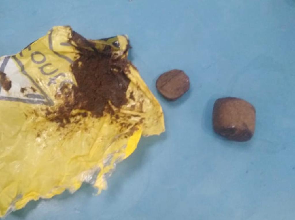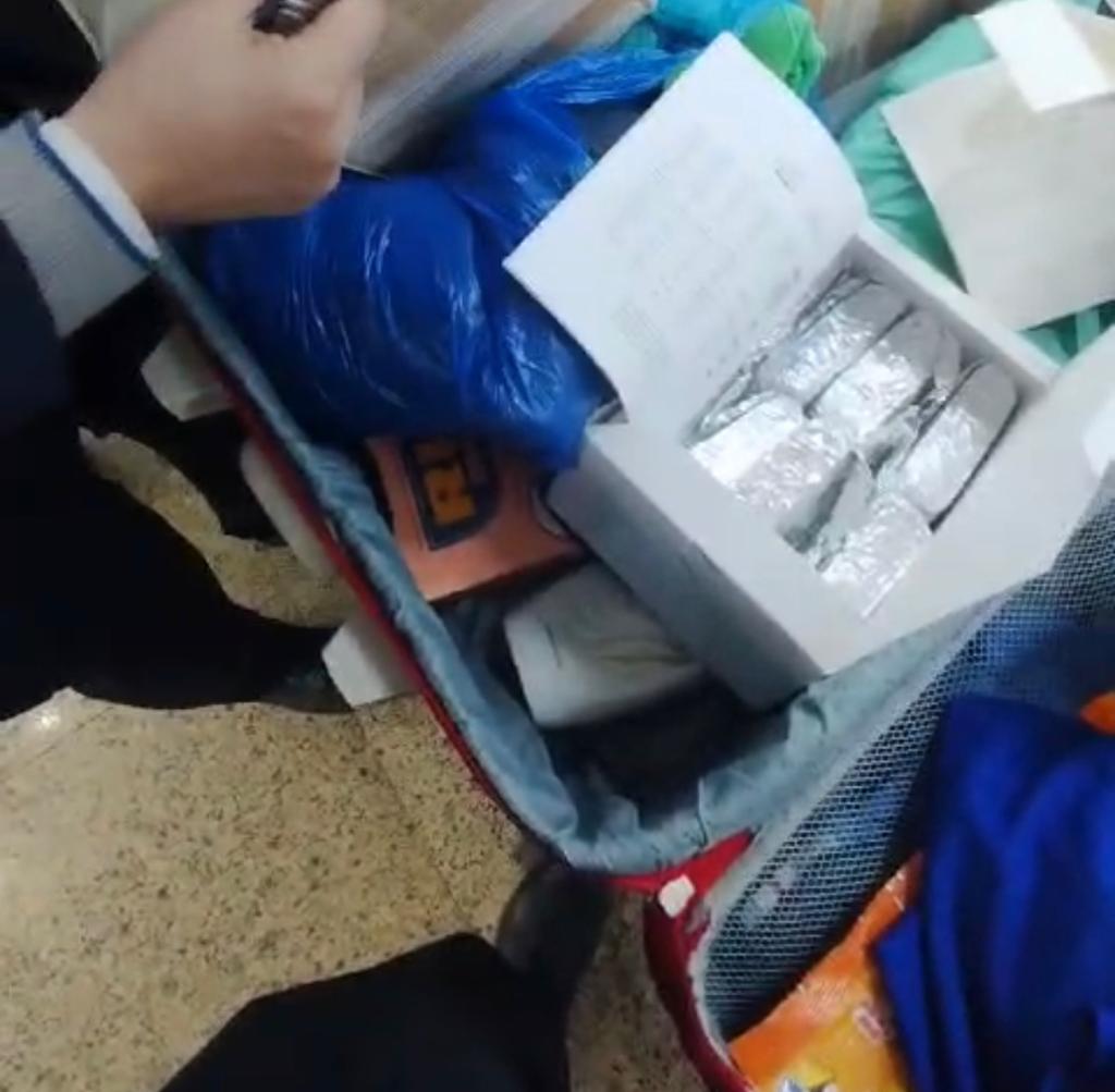 وبتفتيش حقائب الراكبين علي جهاز الفحص بالأشعة بواسطة عبد الرحمن ناصر صابر مأمور الجمرك والذي تلاحظ له وجود عبوات بها أشياء معتمة، في وجود محمود شحاته رئيس القسم بإدارة الفحص بالأشعة، وقام مينا رمزي مدير الحركة المشرف على صالة الوصول رقم ٣ بمبني الركاب رقم ١ بتكليف إبراهيم مصطفي مأمور الجمرك، بتفتيش حقائب الراكبين يدويا والذي تلاحظ له وجود عبوات كرتونية خاصة باغذية وأشياء أخرى، بداخلها عبوات تكرارية ملفوفة بأوراق الومنيوم فضية اللون، بغرض عدم إظهارها علي جهاز الفحص بالأشعة.