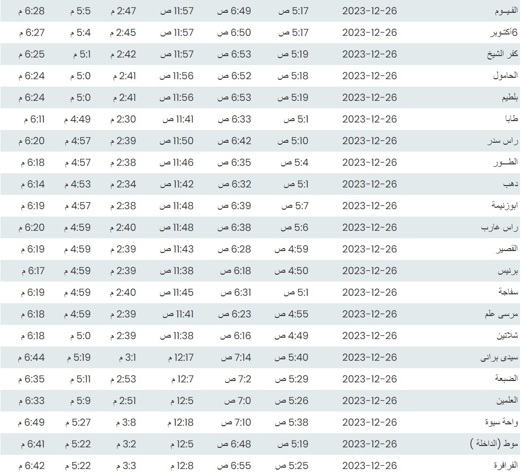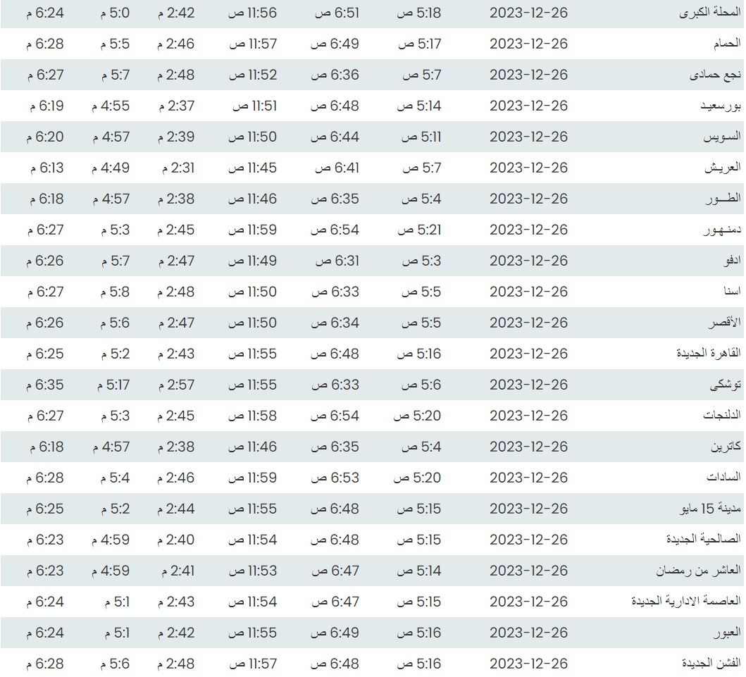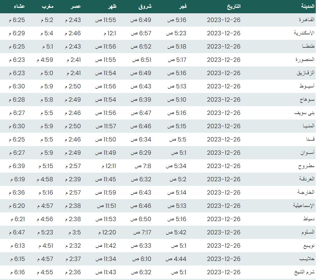 وفيما يلي مواقيت الصلاة، لعدد من مدن ومحافظات الجمهورية من واقع بيانات الهيئة العامة للمساحة
