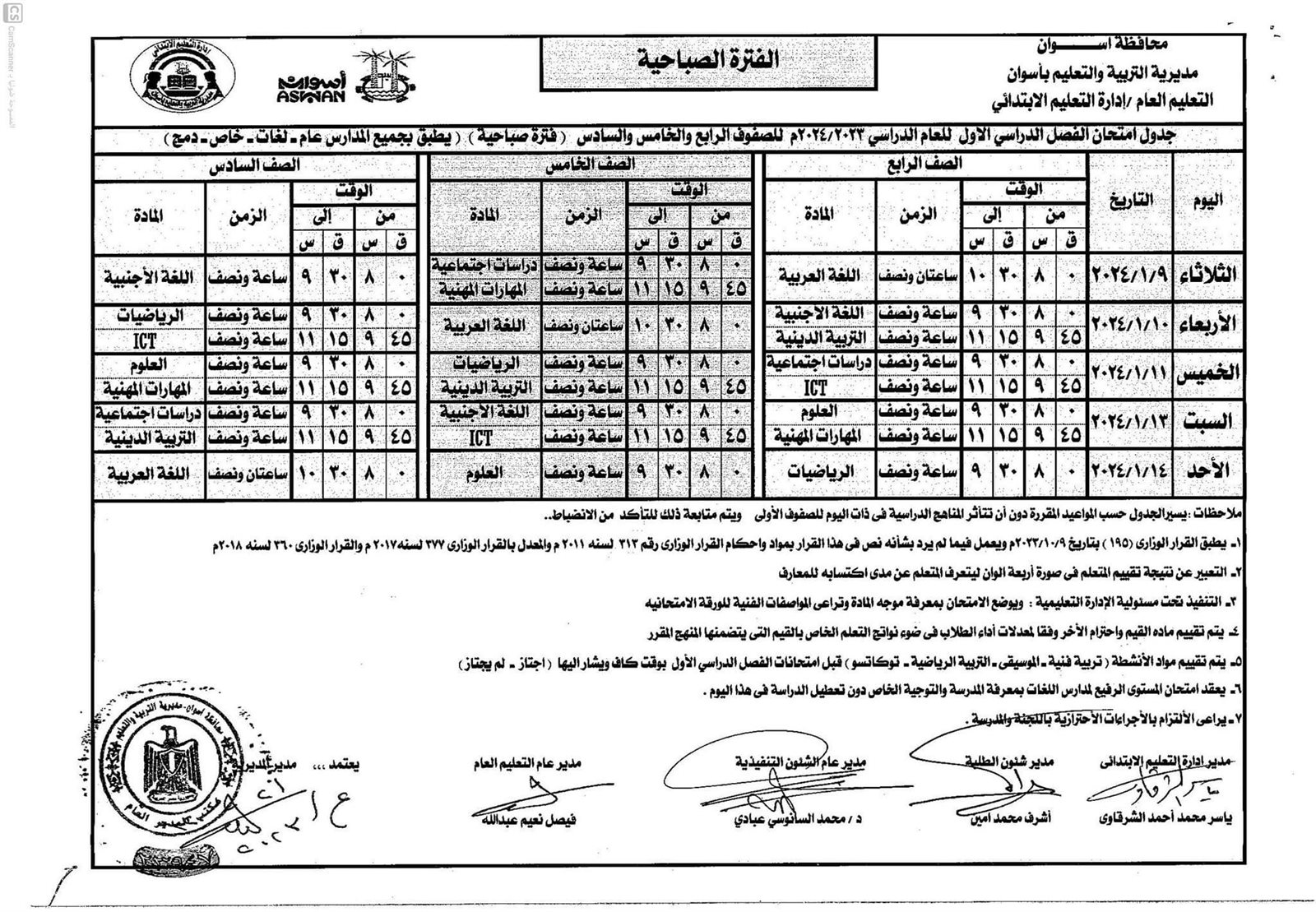 جداول امتحانات الفصل الدراسى الأول للمرحلة الابتدائية بأسوان