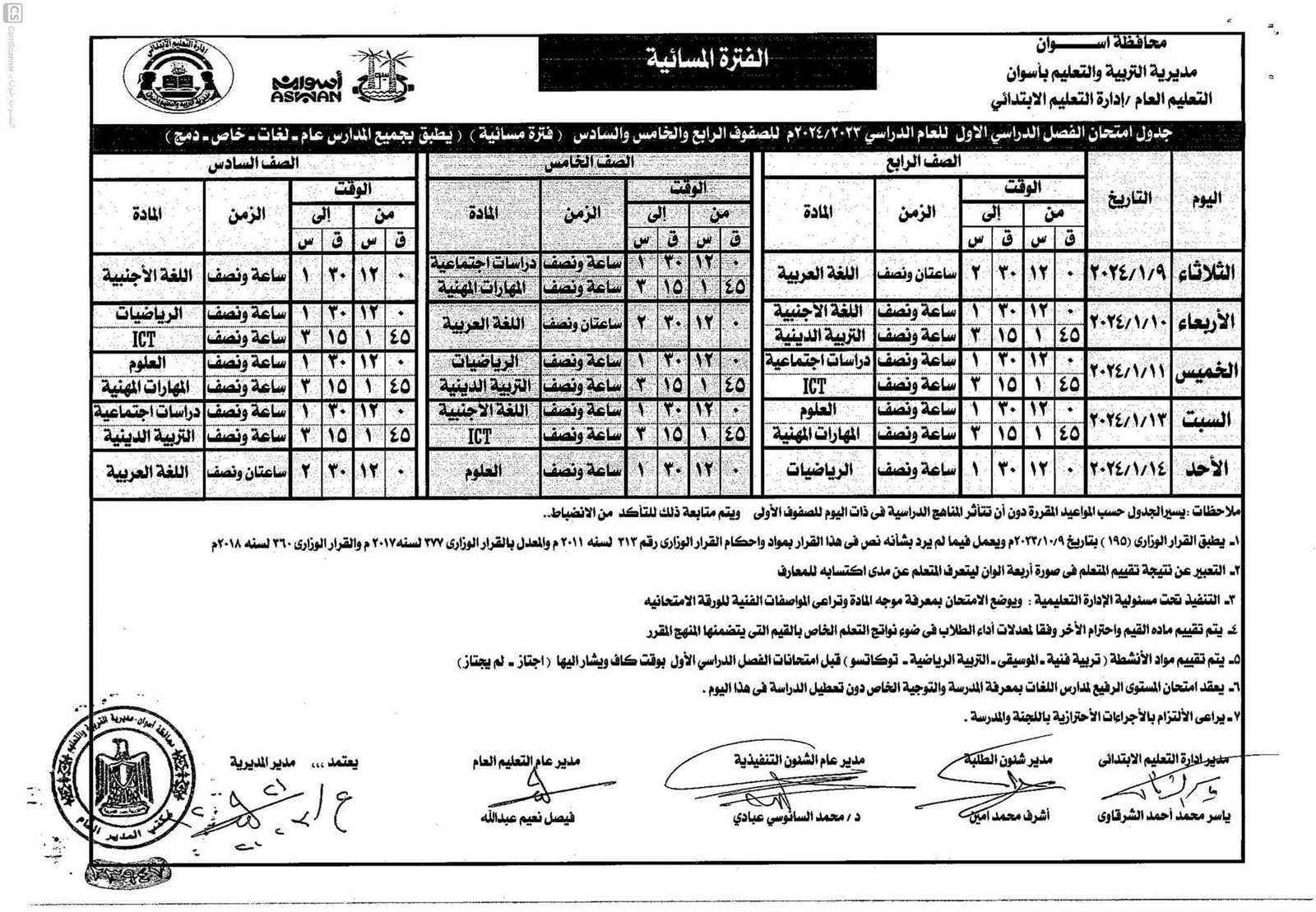 أعلنت مديرية التربية والتعليم بمحافظة أسوان، اليوم السبت، عن جداول امتحانات الفصل الدراسى الأول للصفوف الرابع، الخامس، السادس الابتدائى لمدارس الفترة الصباحية والمسائية عام، خاص، لغات ودمج للعام الدراسى ٢٠٢٤/٢٠٢٣.