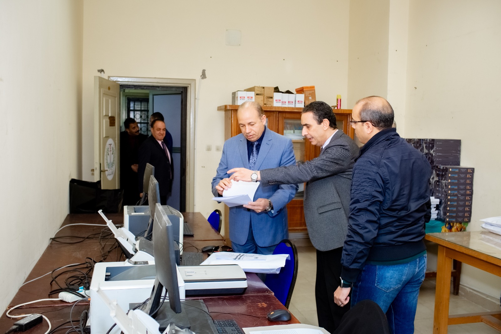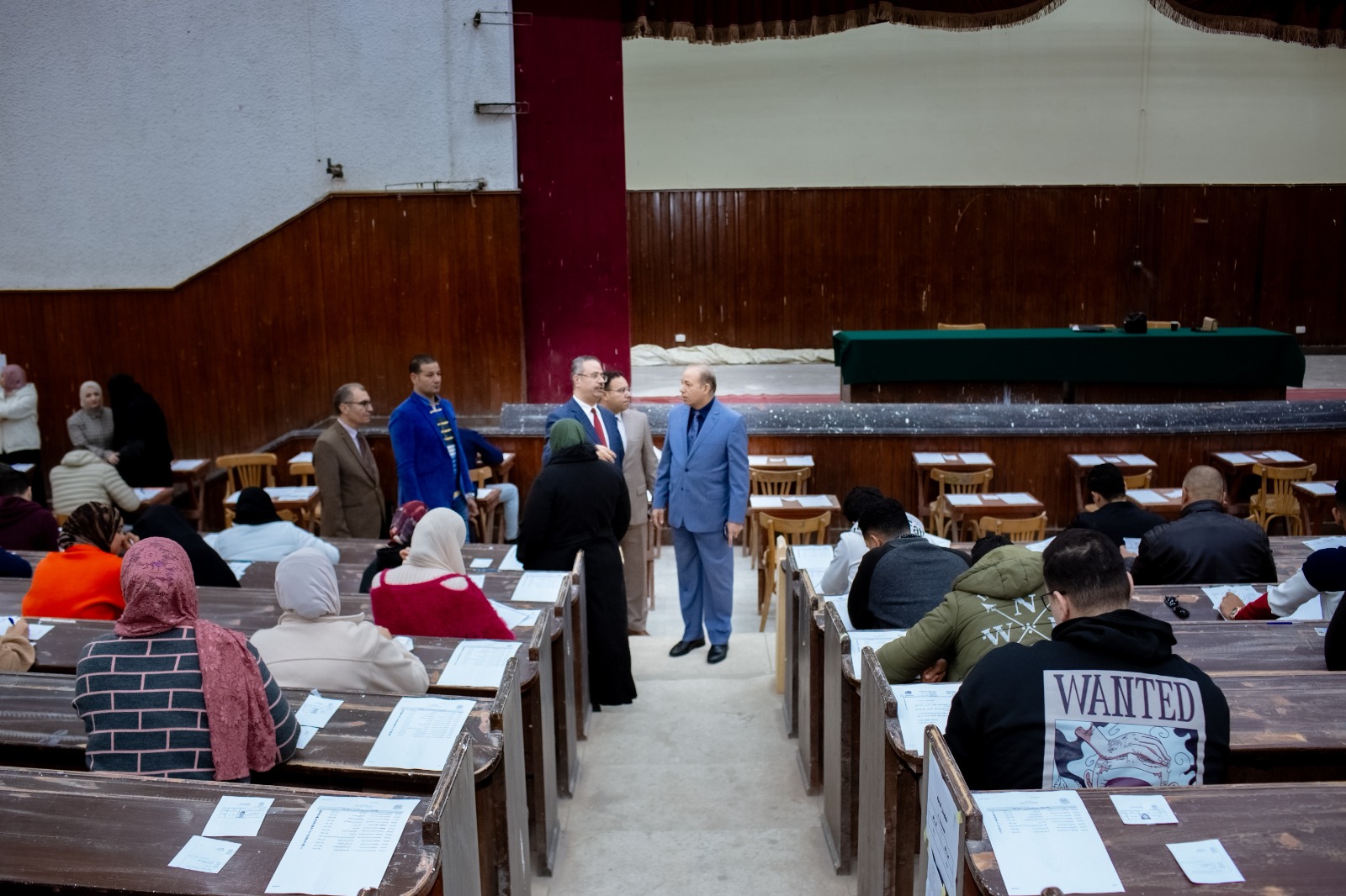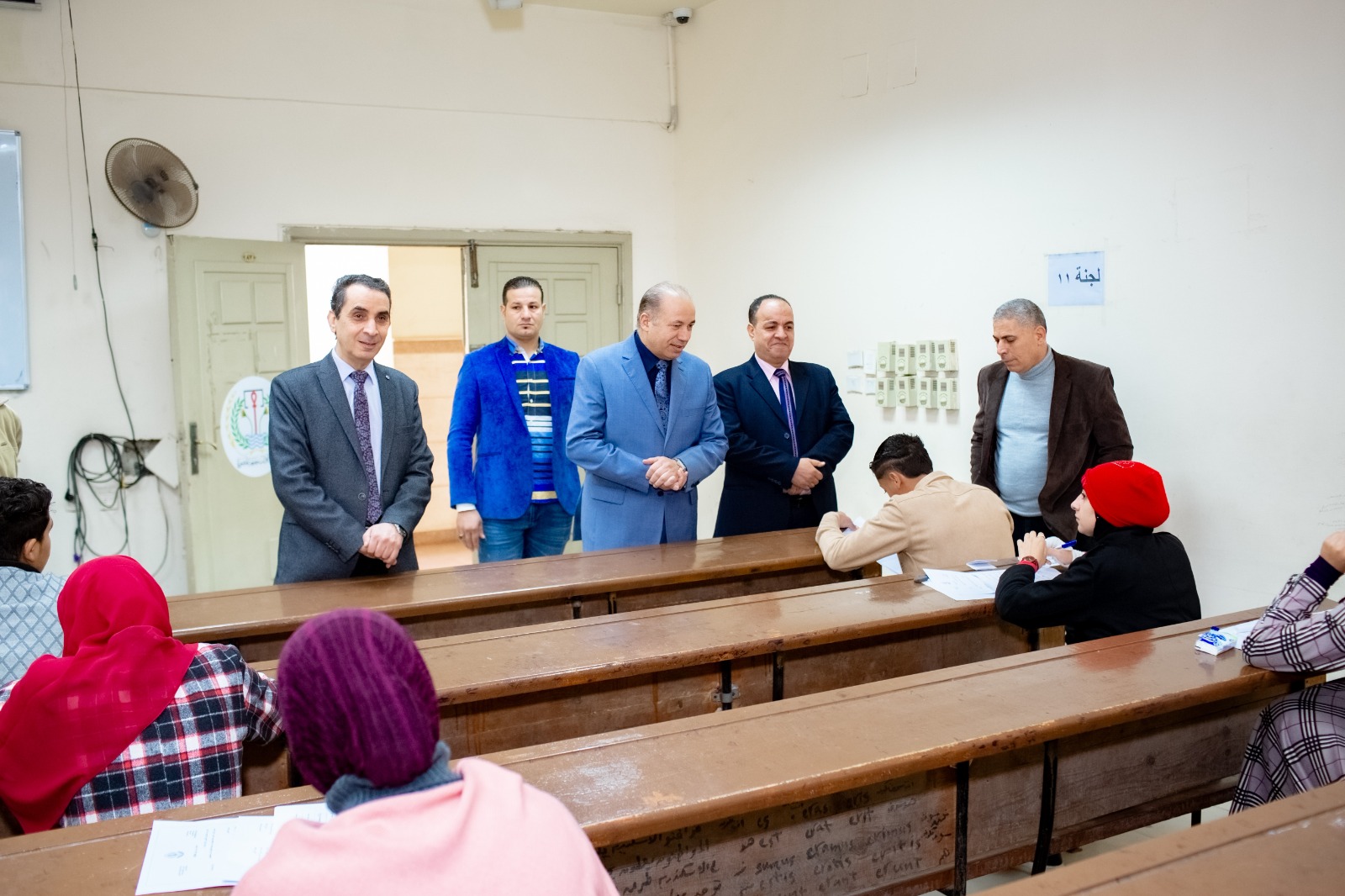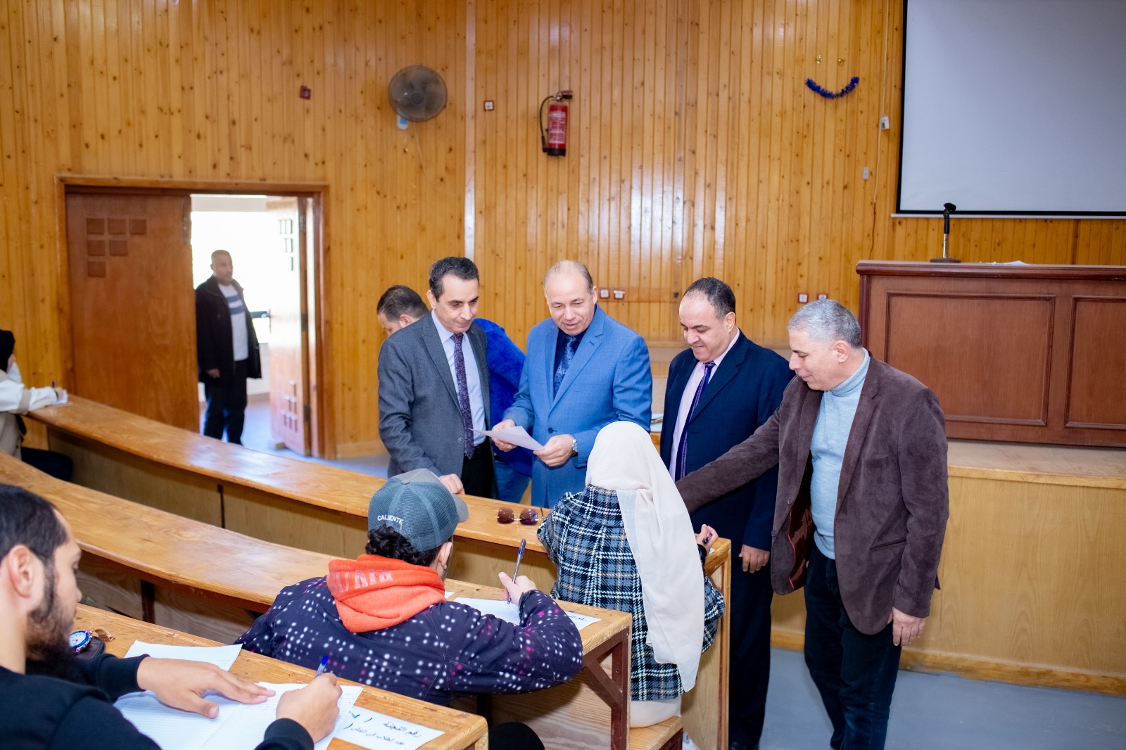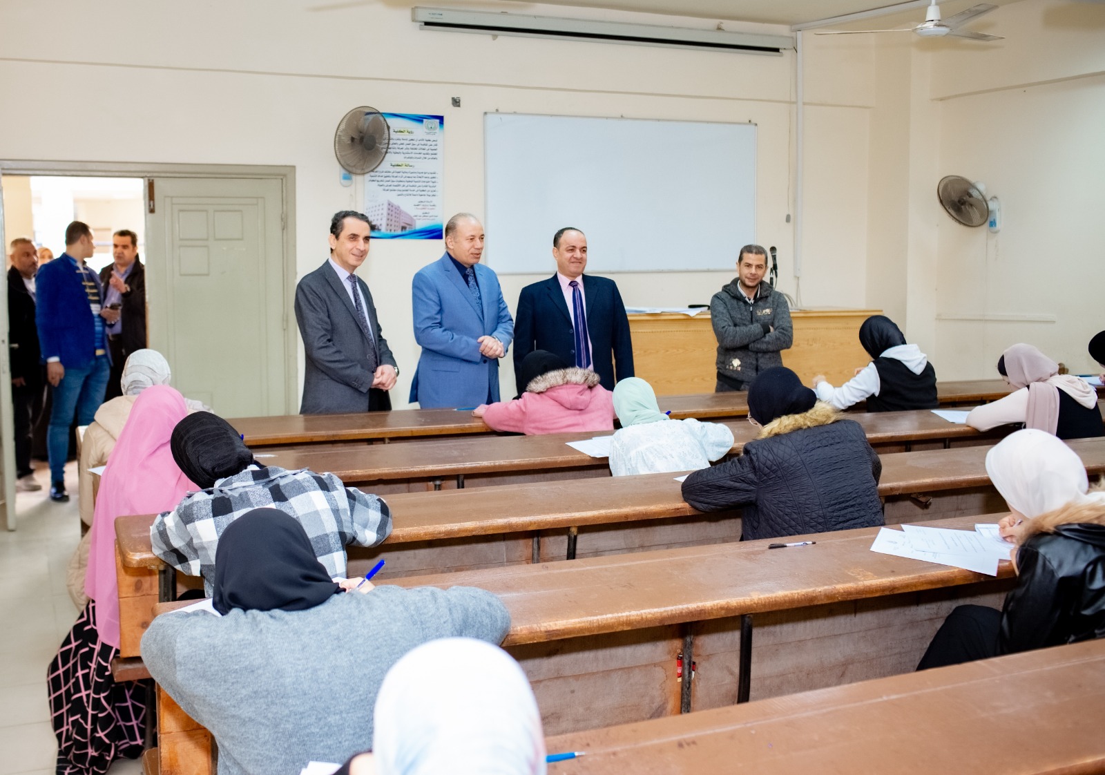 وتفقد خلال الجولة أعمال الإمتحانات بقاعات الاختبارات الالكترونية والمدرجات لمرحلتى الليسانس والدراسات العليا كما تفقد ما تم من عمليات تطوير بالمدرجات الكبرى بالكلية.