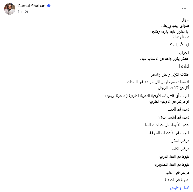 وعن الأطراف الباردة وارتباطها ببعض الأمراض، قال الدكتور جمال شعبان: "صوابع ايدي ورجلي.. يا دكتور دايمًا باردة ومثلجة صيفًا وشتاءً ايه الأسباب؟! الجواب.. ممكن يكون واحد من الأسباب دي: انفلونزا، حالات التوتر والقلق والذعر، الأنيميا: هيموجلوبين أقل من ١٢ في السيدات، وأقل من ١٣ في الرجال".