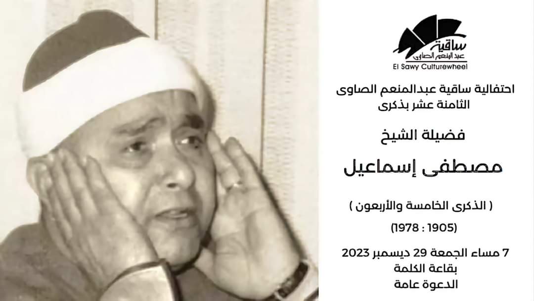 إذ تُقام احتفالية ساقية الصاوي بذكرى الشيخ مصطفى إسماعيل في السابعة من مساء الجمعة 29 ديسمبر الجاري بقاعة الكلمة.. وتبدأ بعرض وبسماع التسجيلات الجديدة للشيخ التي تعرضها أسرته للمرة الأولى، وبعض من تحليلات هيثم أبو زيد.