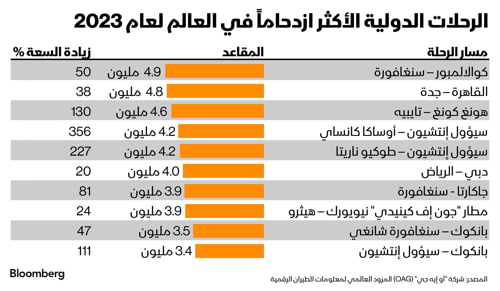 ولكن قفز عدد المقاعد على متن الطائرة بنسبة 50% مقارنةً بالعام الماضي لتصل إلى 4.9 مليون، وفقًا لدليل الخطوط الجوية الرسمية (OAG). احتل المسار نفسه المرتبة الثالثة في عام 2022، بينما جاء ثانيًا قبل تفشي الوباء.