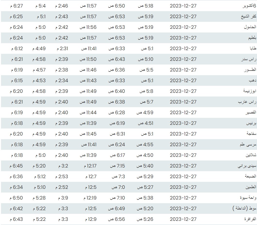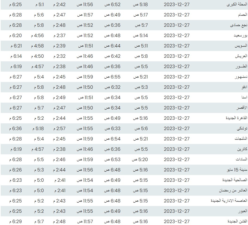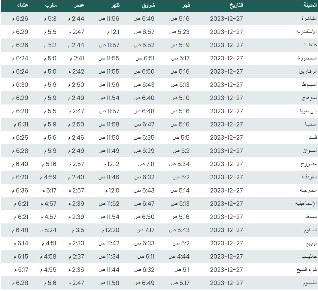 وفيما يلي مواقيت الصلاة، لعدد من مدن ومحافظات الجمهورية من واقع بيانات الهيئة العامة للمساحة