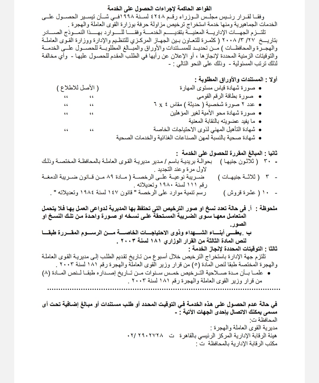 وبالنسبة للرسوم، فإن رسوم استخراج الترخيص تبلغ 33.10 جنيهًا، ويتم دفعها عن طريق حوالة بريدية باسم مدير مديرية القوى العاملة بالمحافظة المختصة، سواء في حالة الحصول على الترخيص لأول مرة أو عند التجديد.
