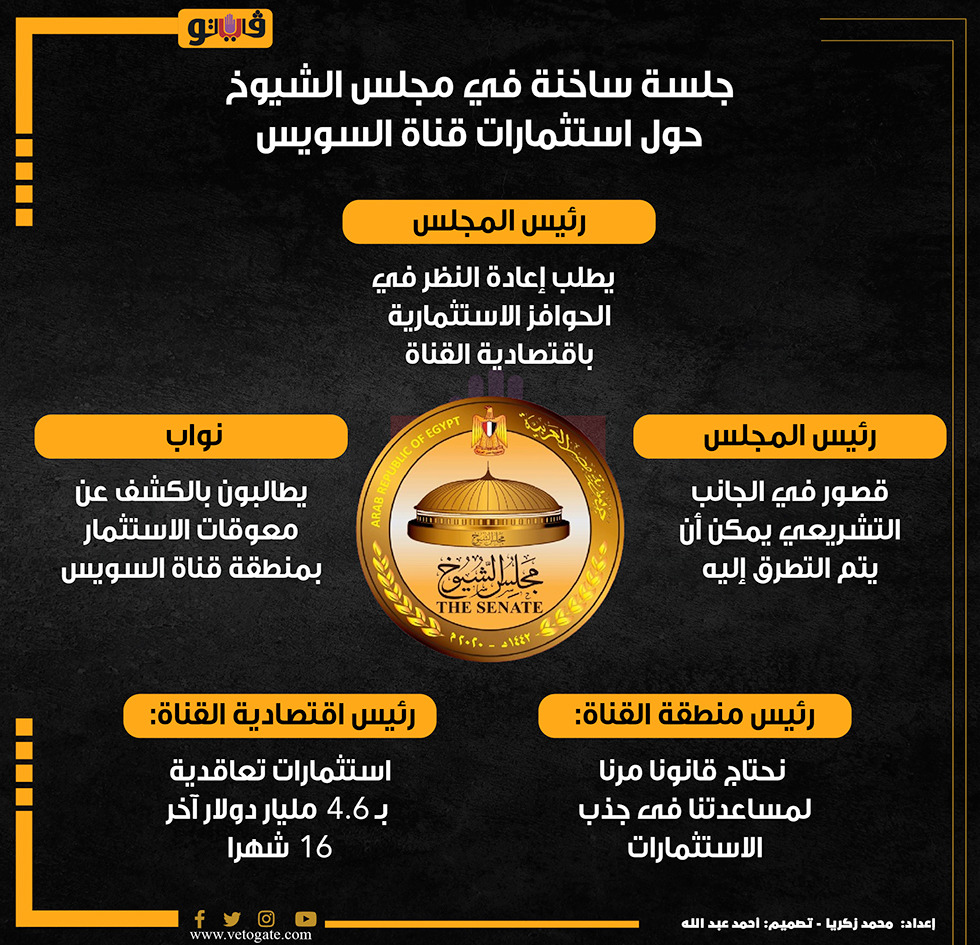 جلسة ساخنة في مجلس الشيوخ حول استثمارات قناة السويس (إنفوجراف) الأحد 24/ديسمبر/2023 - 03:40 م 12/24/2023 3:40:20 PM مجلس الشيوخ، فيتو محمد زكريا شارك طباعة 18 حجم الخط شارك طباعة اقتصادية قناة السويس جذب الاستثمارات مجلس الشيوخ قناة السويس منطقة قناة السويس معوقات الاستثمار
