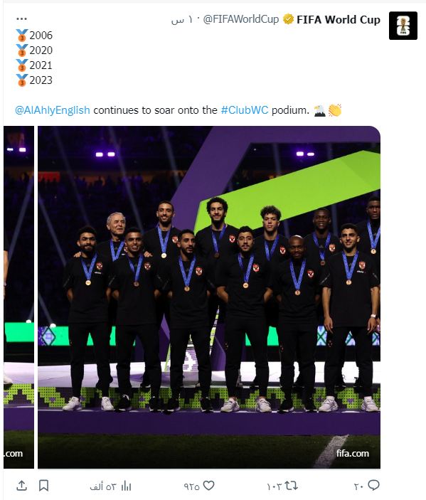 احتفى الحساب الرسمي لـ الاتحاد الدولي لكرة القدم - فيفا، اليوم الأحد، بحصول النادي الأهلي المصري على برونزية كأس العالم للأندية 2023، للمرة الرابعة في تاريخه.