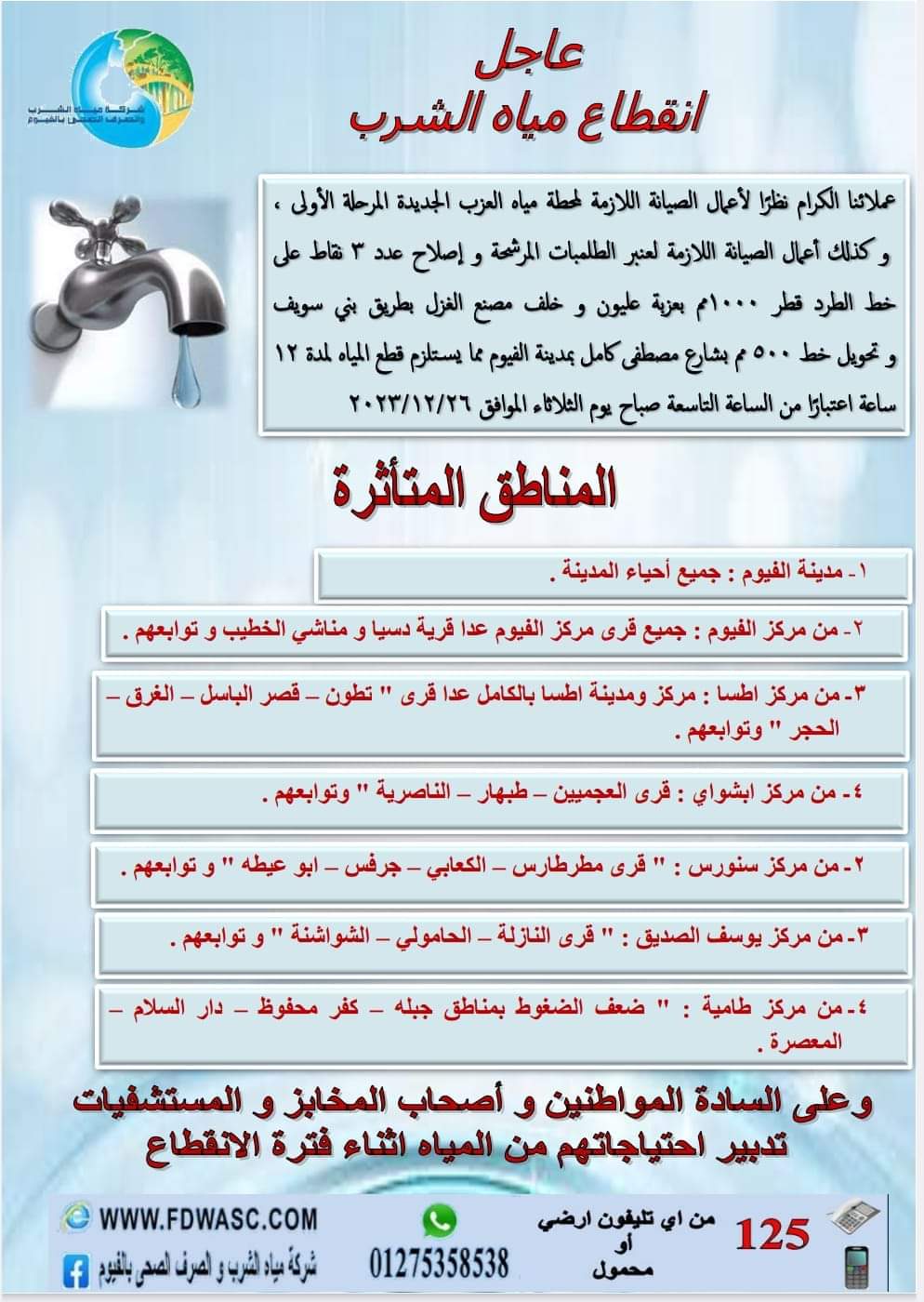 وطلبت شركة الفيوم لمياه الشرب والصرف الصحى، من المواطنين وأصحاب المخابز والمستشفيات تخزين احتياجاتهم من المياه طوال فترة الانقطاع في التاريخ والوقت المشار إليه سالفا، وستوفر الشركة فناطيس المياه في حالة الاحتياج إليها، ويتم طلبها من المناطق المتأثرة عن طريق الخط الساخن.
