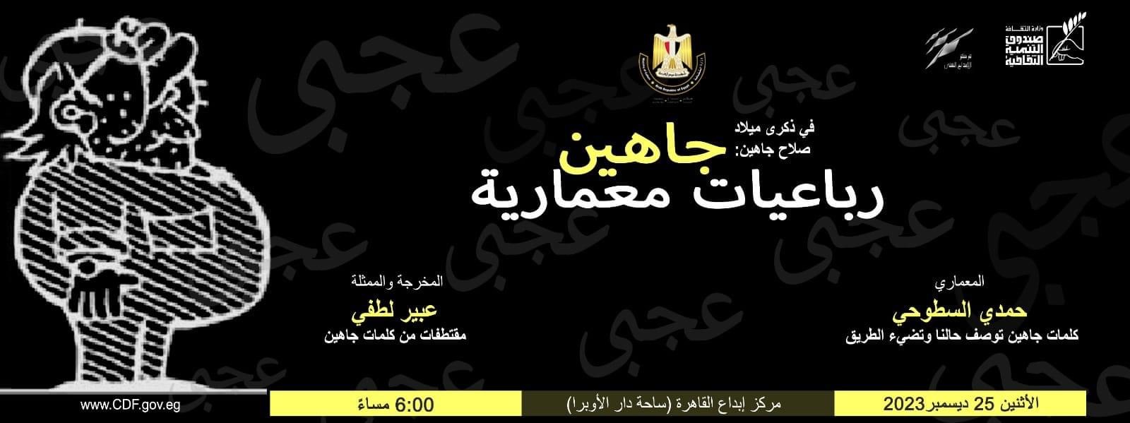 ينظم مركز الإبداع الفنى بساحة الأوبرا، والتابع لقطاع صندوق التنمية الثقافية برئاسة الدكتور وليد قانوش أمسية ثقافية فى ذكرى ميلاد الشاعر الكبير صلاح جاهين في السادسة مساء اليوم الإثنين 25 ديسمبر الجاري.