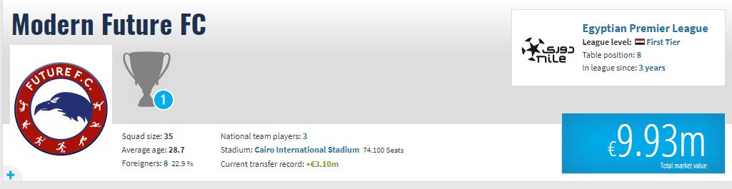 بلغت القيمة التسويقية لفريق مودرن فيوتشر 9 مليون و930 ألف يورو ويعد أعلي اللاعبين قيمة أحمد رفعت مليون و200 ألف يورو، عمر كمال عبدالواحد مليون يورو.