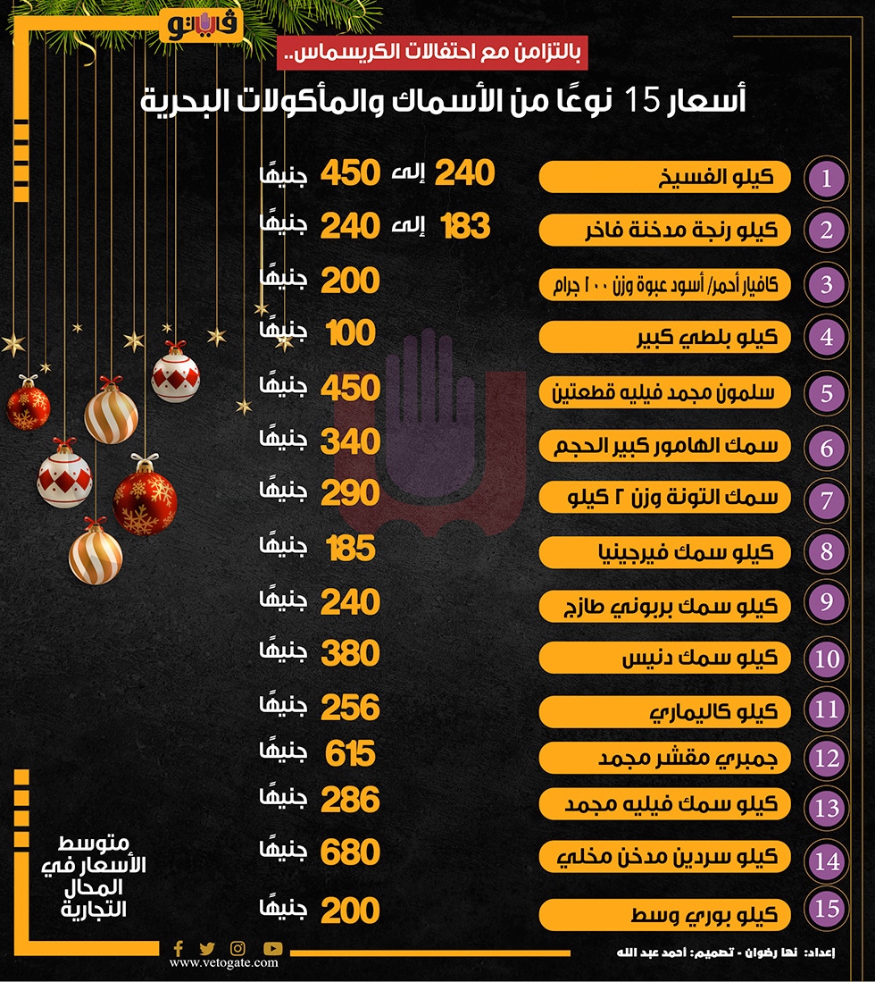 بالتزامن مع احتفالات الكريسماس.. أسعار 15 نوعًا من الأسماك والمأكولات البحرية (إنفوجراف) الأربعاء 27/ديسمبر/2023 - 09:14 م 12/27/2023 9:14:38 PM أسعار الأسماك بالتزامن مع قرب احتفالات الكريسماس، فيتو نها رضوان شارك طباعة 18 حجم الخط شارك طباعة احتفالات الكريسماس أسعار الأسماك اسعار الاسماك والماكولات البحرية المأكولات البحرية المحال التجارية سعر البوري سعر البلطى سعر الجمبري سعر الكافيار سعر الفسيخ سعر الرنجة سعر الكاليماري سعر السمك